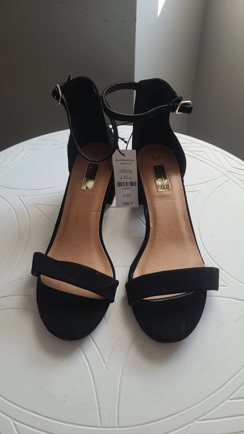 New with tags. These black block heel sandals feature a comfortable fit and adjustable ankle strap. The faux suede material gives them a sleek look. Size is 7. Original price was $34.99.