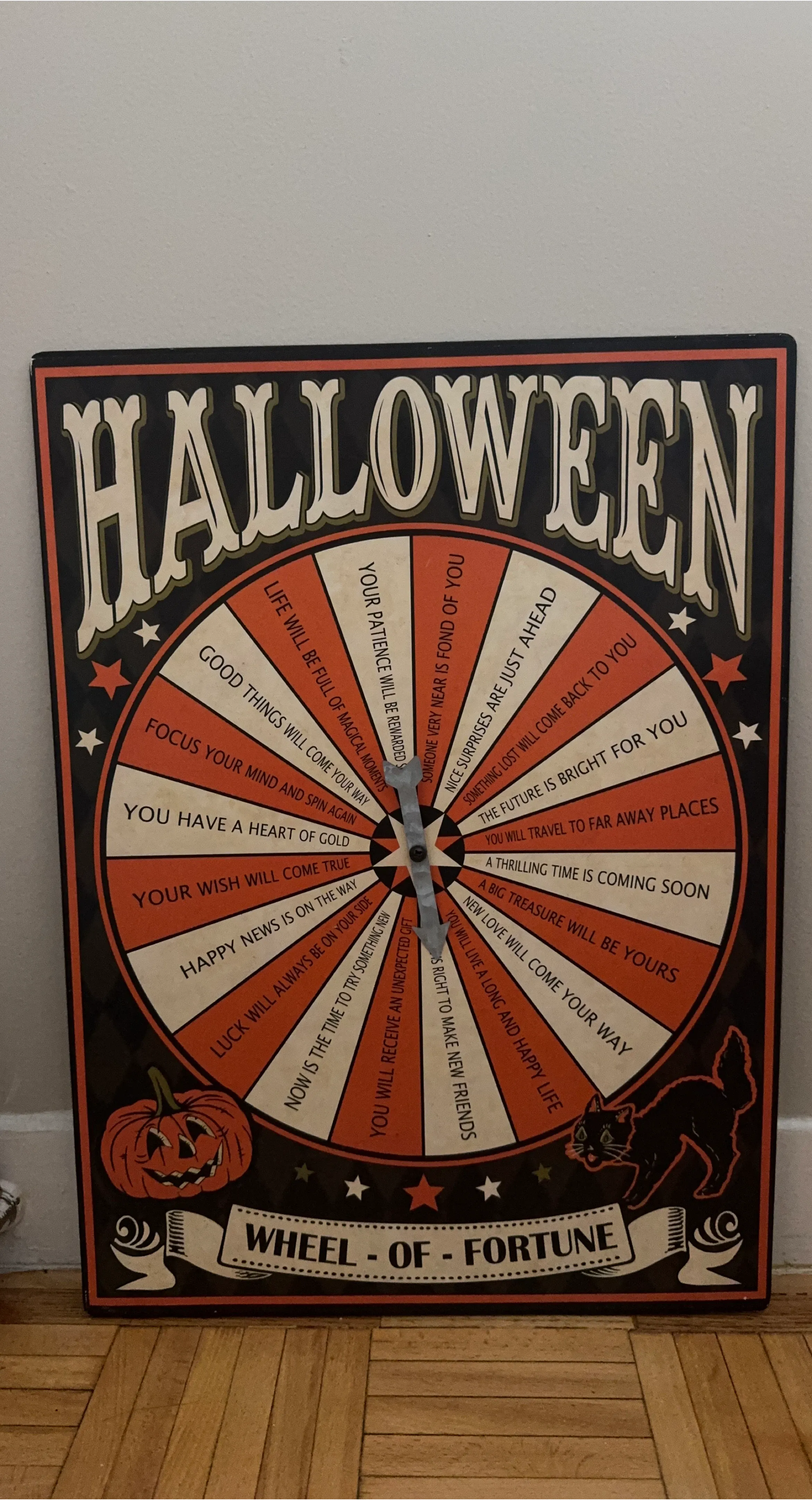 Selling a Halloween-themed Wheel of Fortune decoration! It's a fun piece with a vintage look, featuring classic Halloween imagery like a pumpkin and a black cat. The wheel includes various fortunes and sayings to add a bit of spooky fun to your Halloween decor