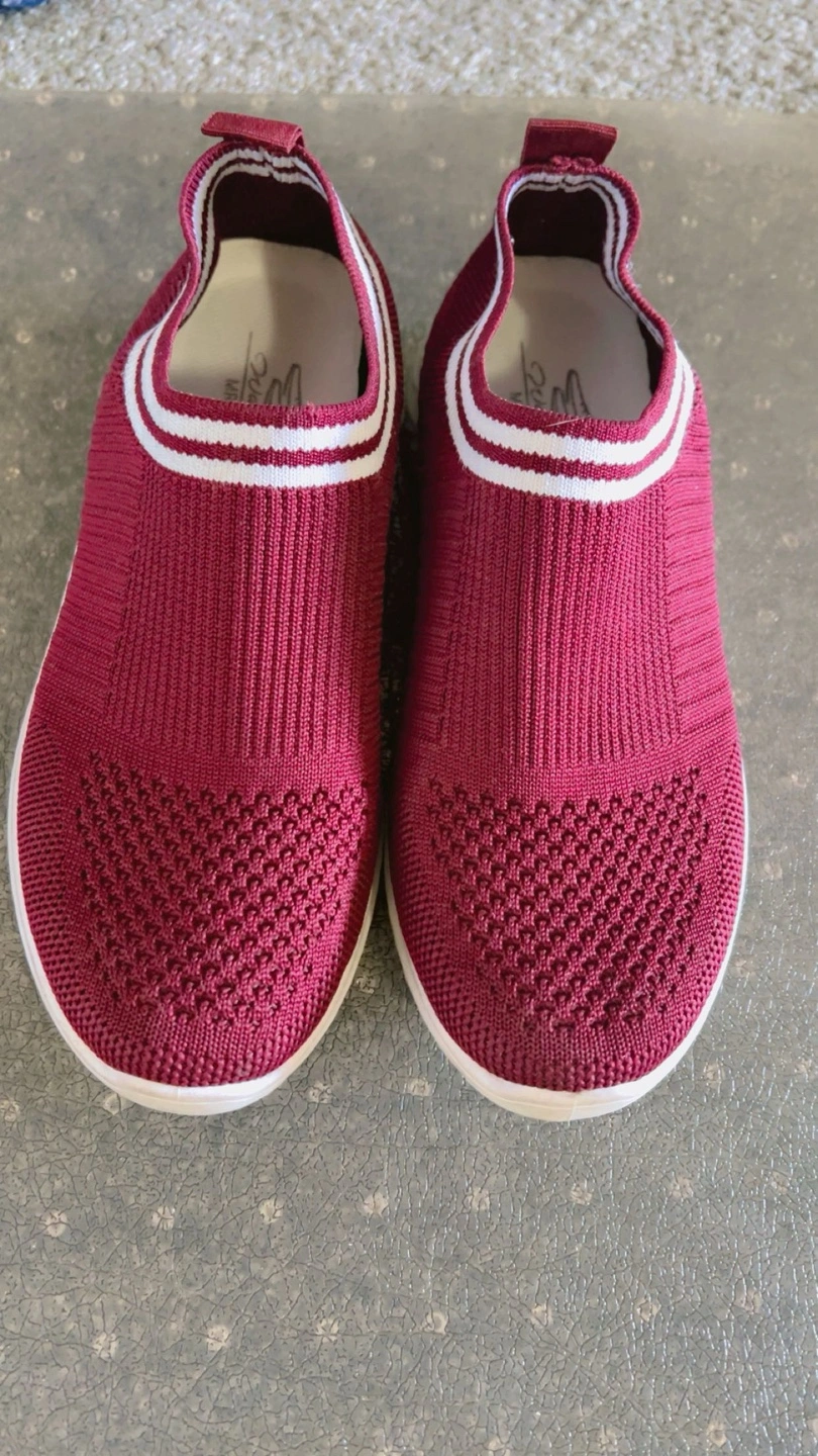 Burgundy slip-on sneakers. Knit fabric upper. White sole. Comfortable casual wear. Size 6 can fit 6.5 too.