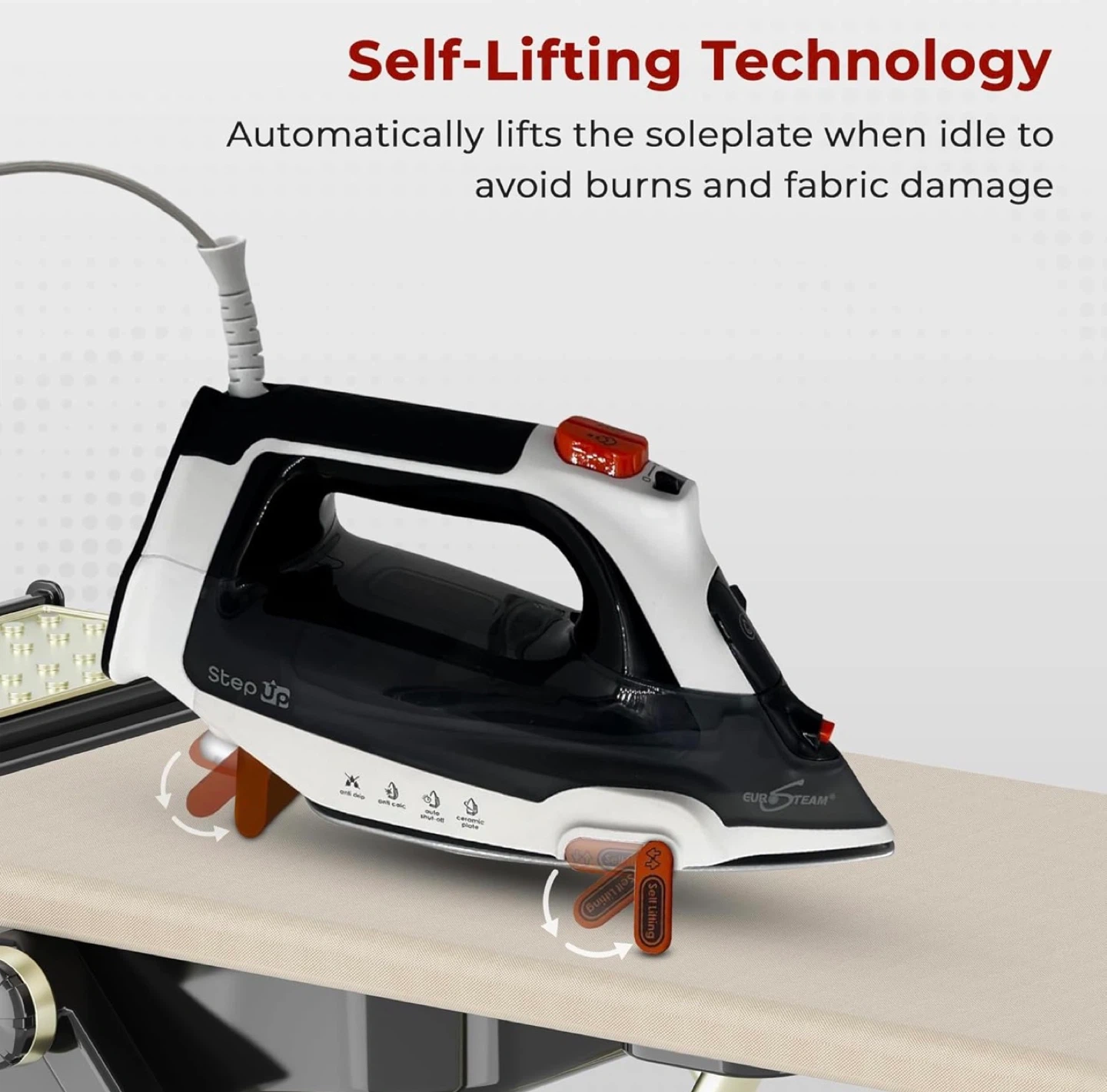 • Smart Auto-Lift Technology: Automatically lifts the iron when the handle is released, preventing burns and enhancing safety.
