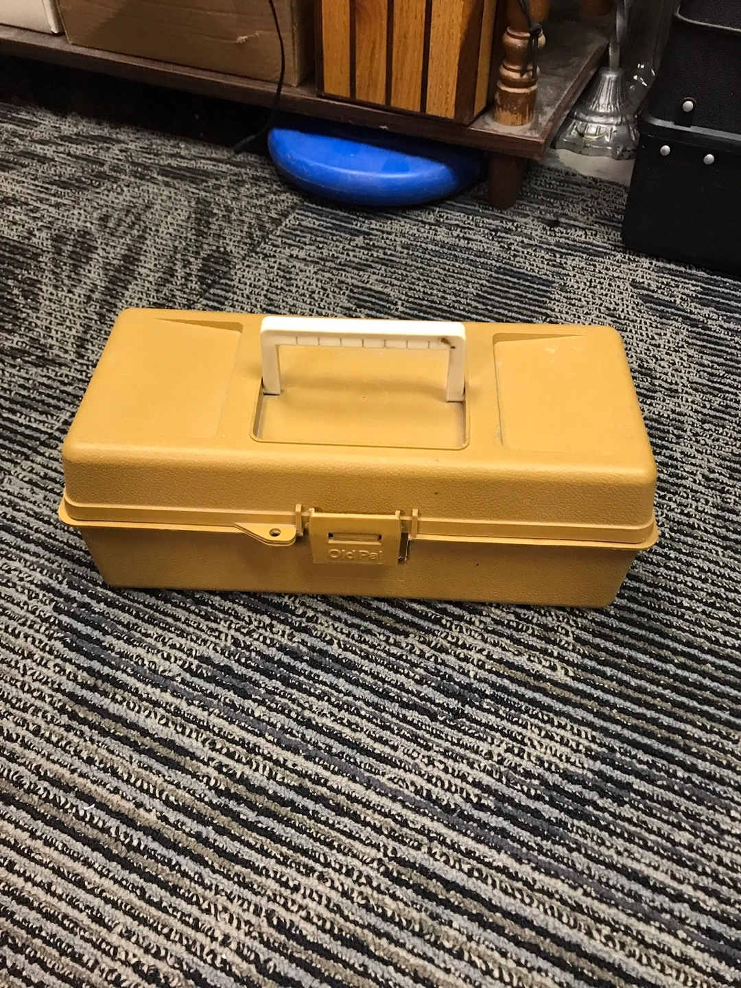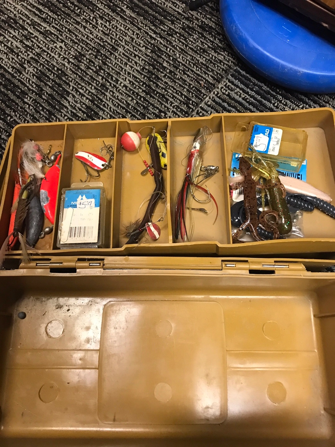 Brown plastic tackle box filled with assorted fishing lures, hooks, and soft baits. Includes a variety of brands like Berkley Gulp!. Great for organizing your fishing gear. $40.00