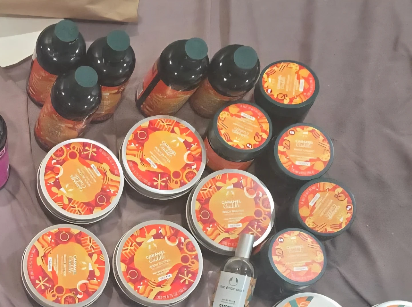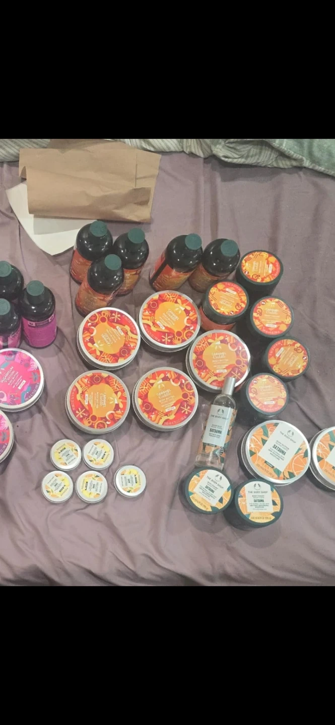 Collection of The Body Shop bath & body products including Caramel body butter, body yogurt, and shower gels.