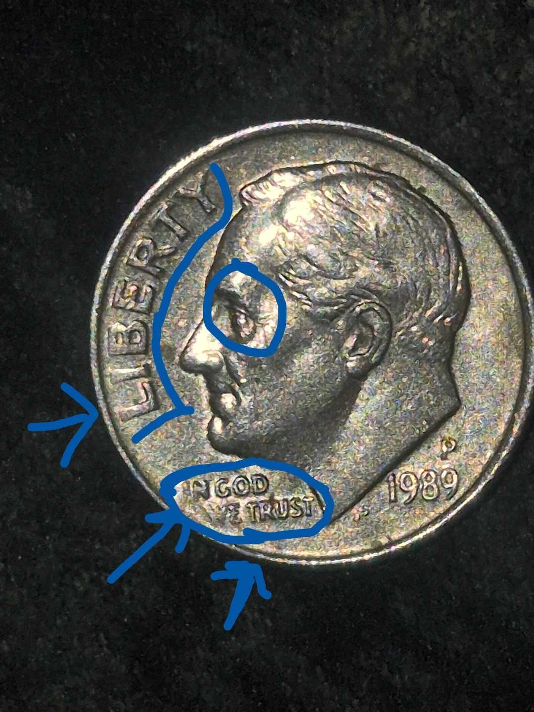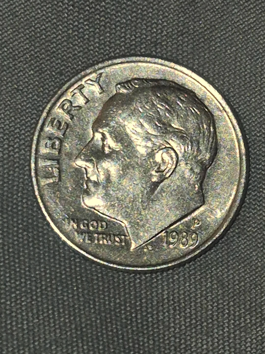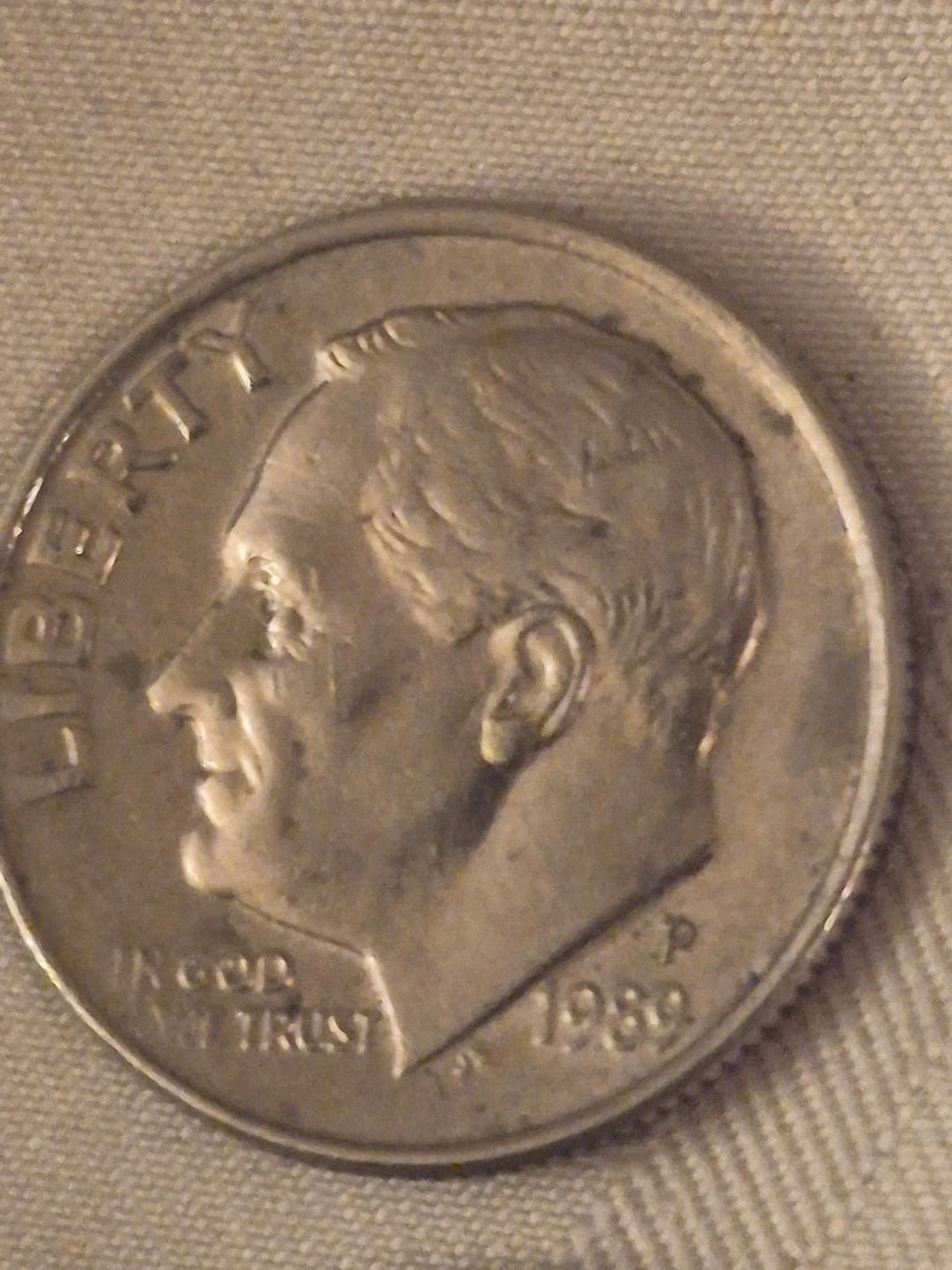 One US dime minted in Denver from 1989. Features President Franklin D. Roosevelt on the obverse. DDOBV LIBERTY, also IN GOD WE TRUST DOUBLE DIE. Roosevelt ear has die issues as well looks like cauliflower ear. Along with two eyes almost 3 eyes error (last Pic.) Great collectors piece. You need just to have it graded and it's worth a bit more.