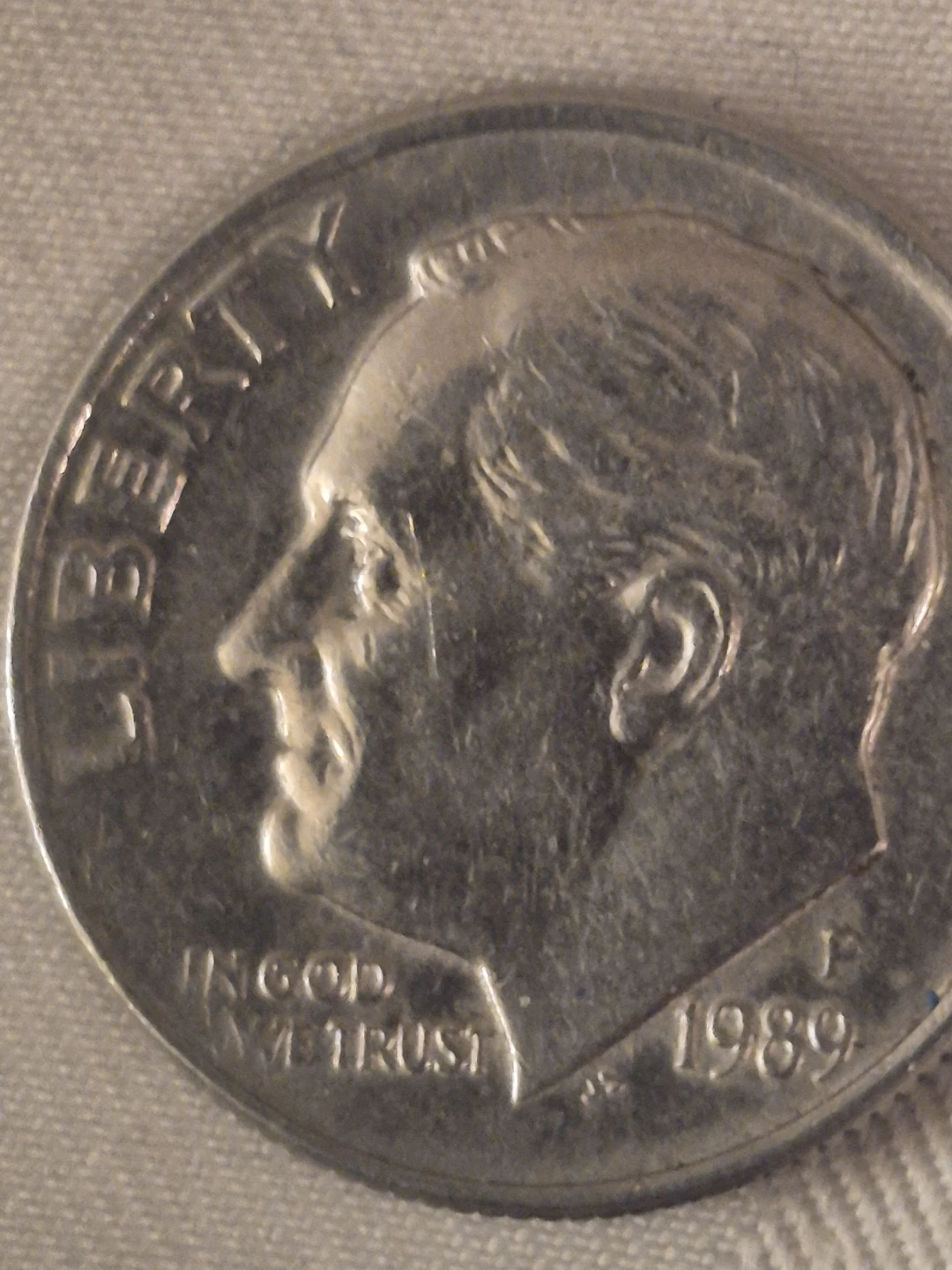 One US dime minted in Denver from 1989. Features President Franklin D. Roosevelt on the obverse. DDOBV LIBERTY, also IN GOD WE TRUST DOUBLE DIE. Roosevelt ear has die issues as well looks like cauliflower ear. Along with two eyes almost 3 eyes error (last Pic.) Great collectors piece. You need just to have it graded and it's worth a bit more.