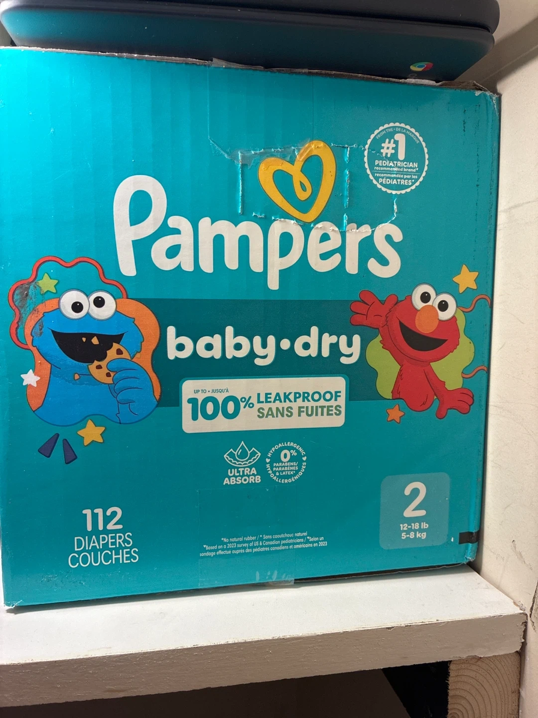 Pampers Baby-Dry diapers in size 2. These offer 100% leakproof protection and are ultra absorbent. Contains 112 diapers per box. Designed for babies 12-18 lbs (5-8 kg).