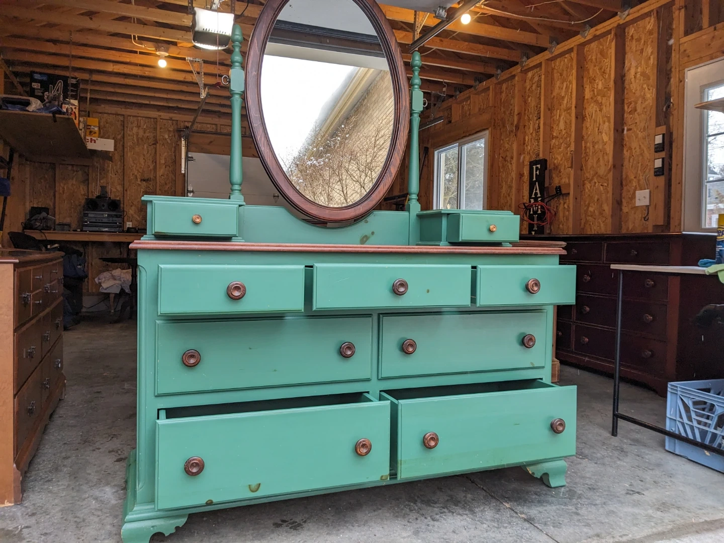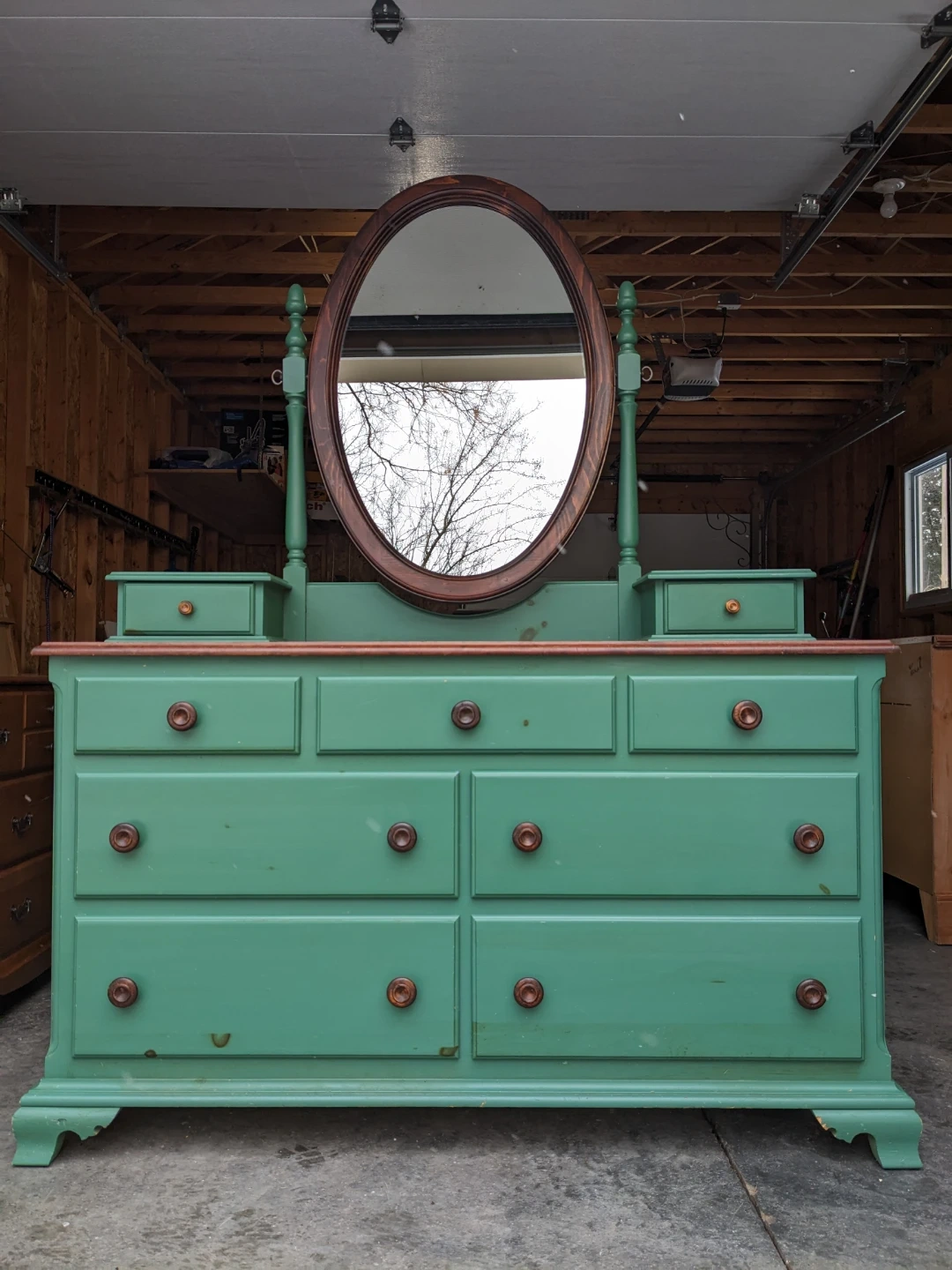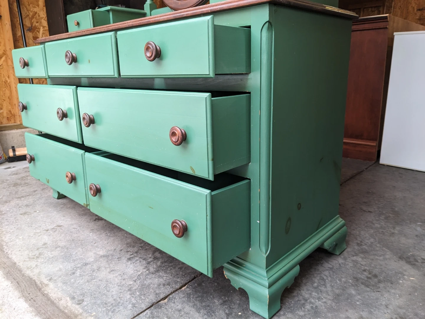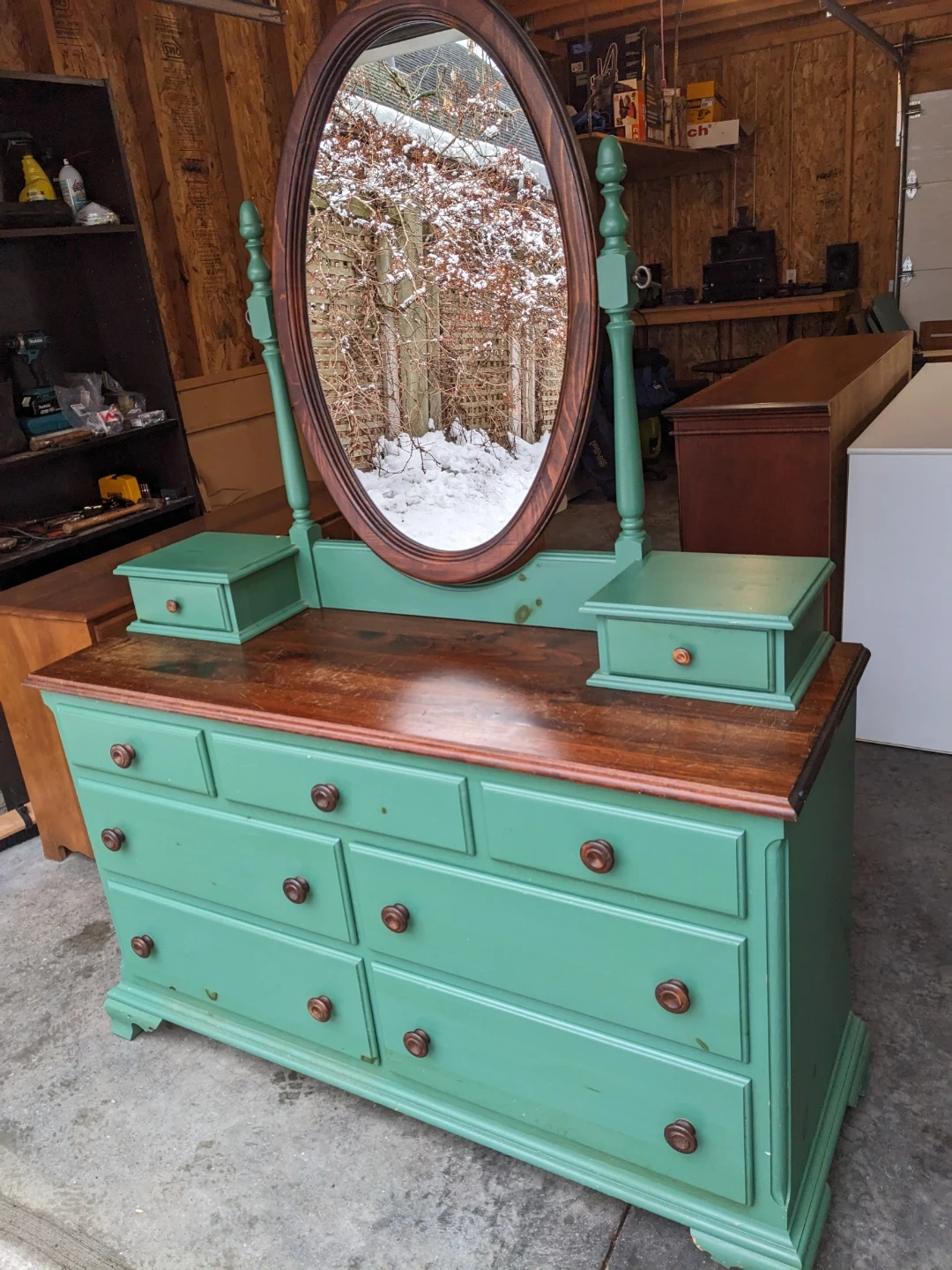 This dresser/vanity combo features 7 spacious drawers and 2 vanity drawers that all open and close perfectly and are in excellent condition inside.