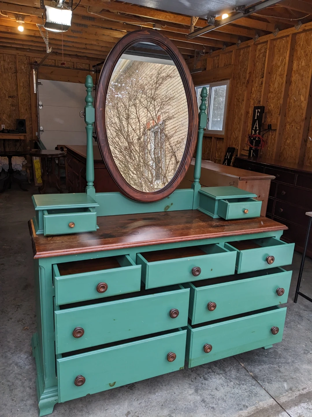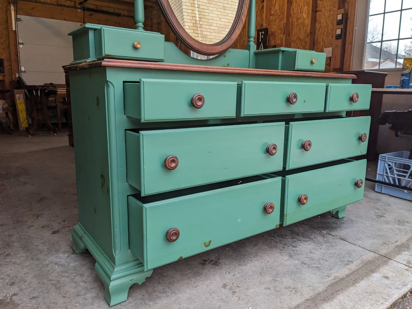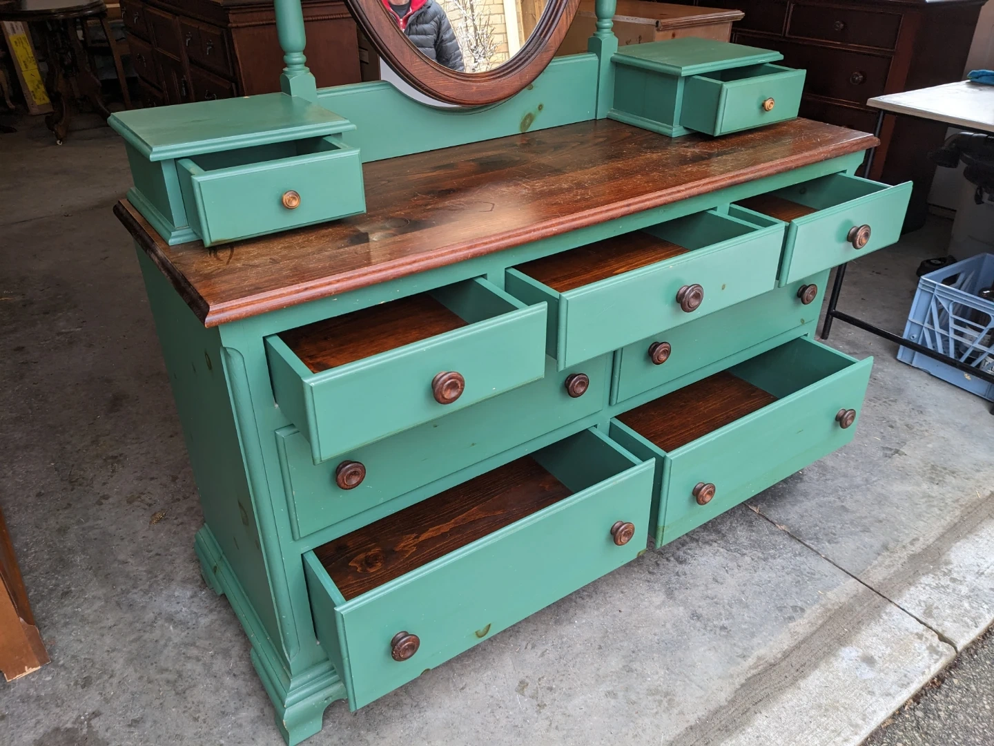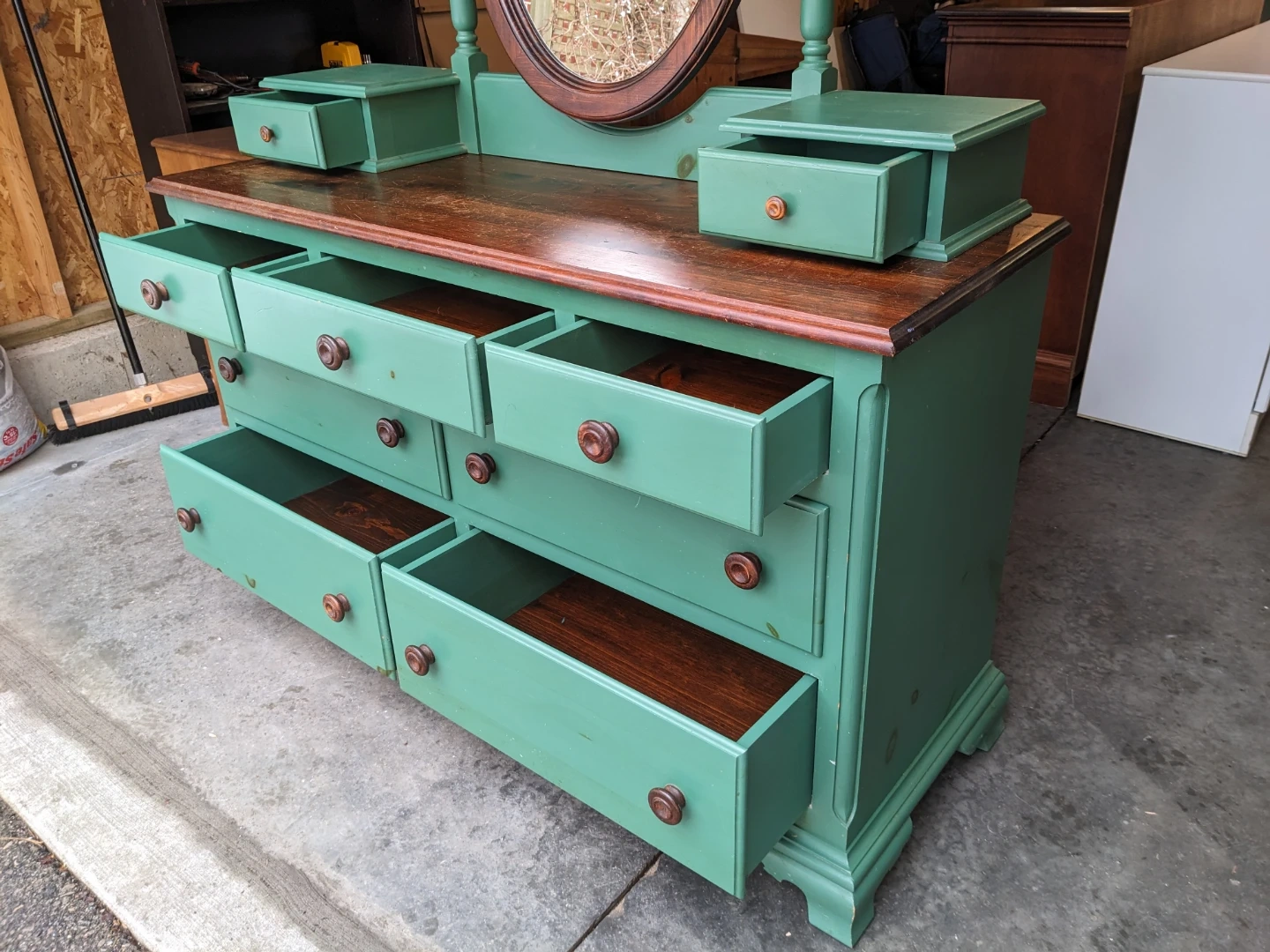 This dresser/vanity combo features 7 spacious drawers and 2 vanity drawers that all open and close perfectly and are in excellent condition inside.