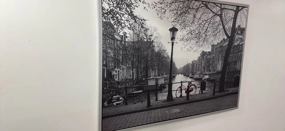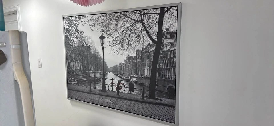 Beautiful framed art for your wall. Has a cool black and white photo of a city canal scene with a red bicycle and street lamp. Silver frame is nice and sleek.