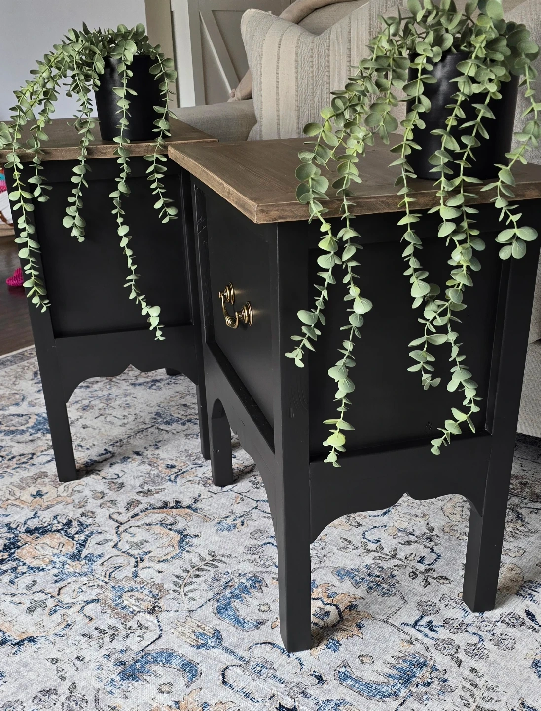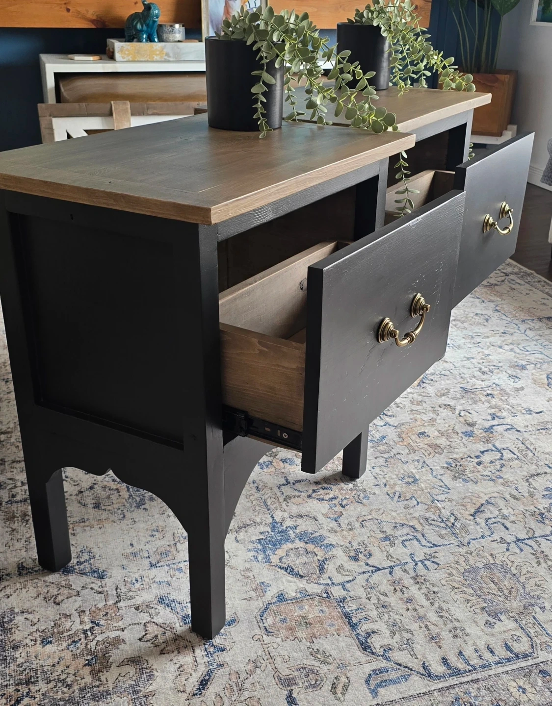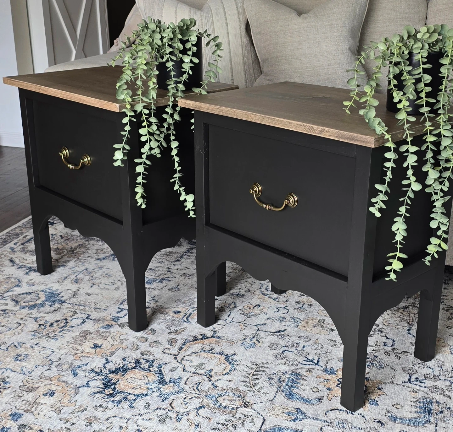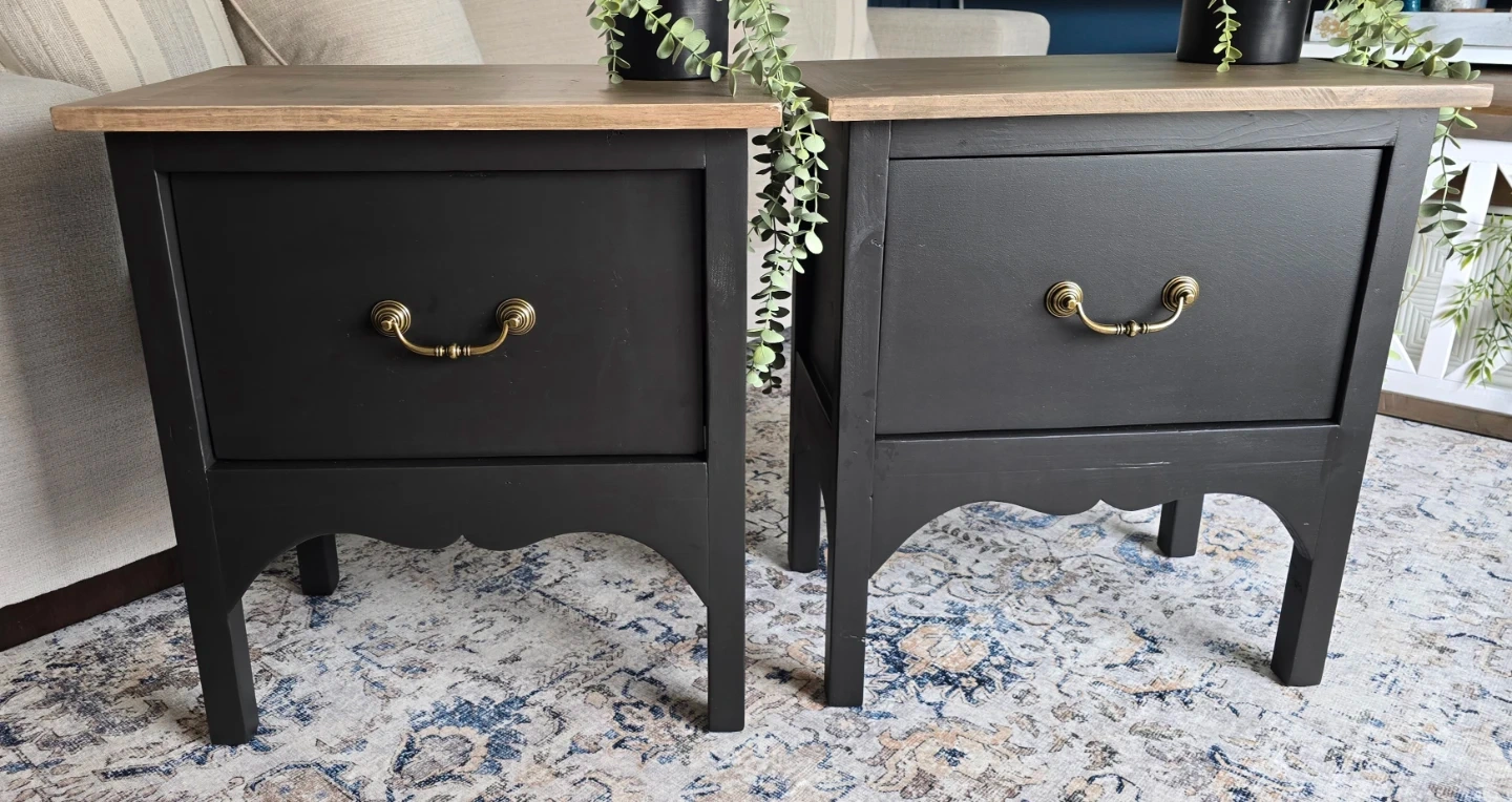 How beautiful are these rustic end tables? I applied a white paint wash then added chocolate stain on the top, which gave it a nice rustic shade and painted the body a satin black. I added a vintage design along the bottom that just completes this piece beautifully. Also Added a drawer with antique brass hardware.