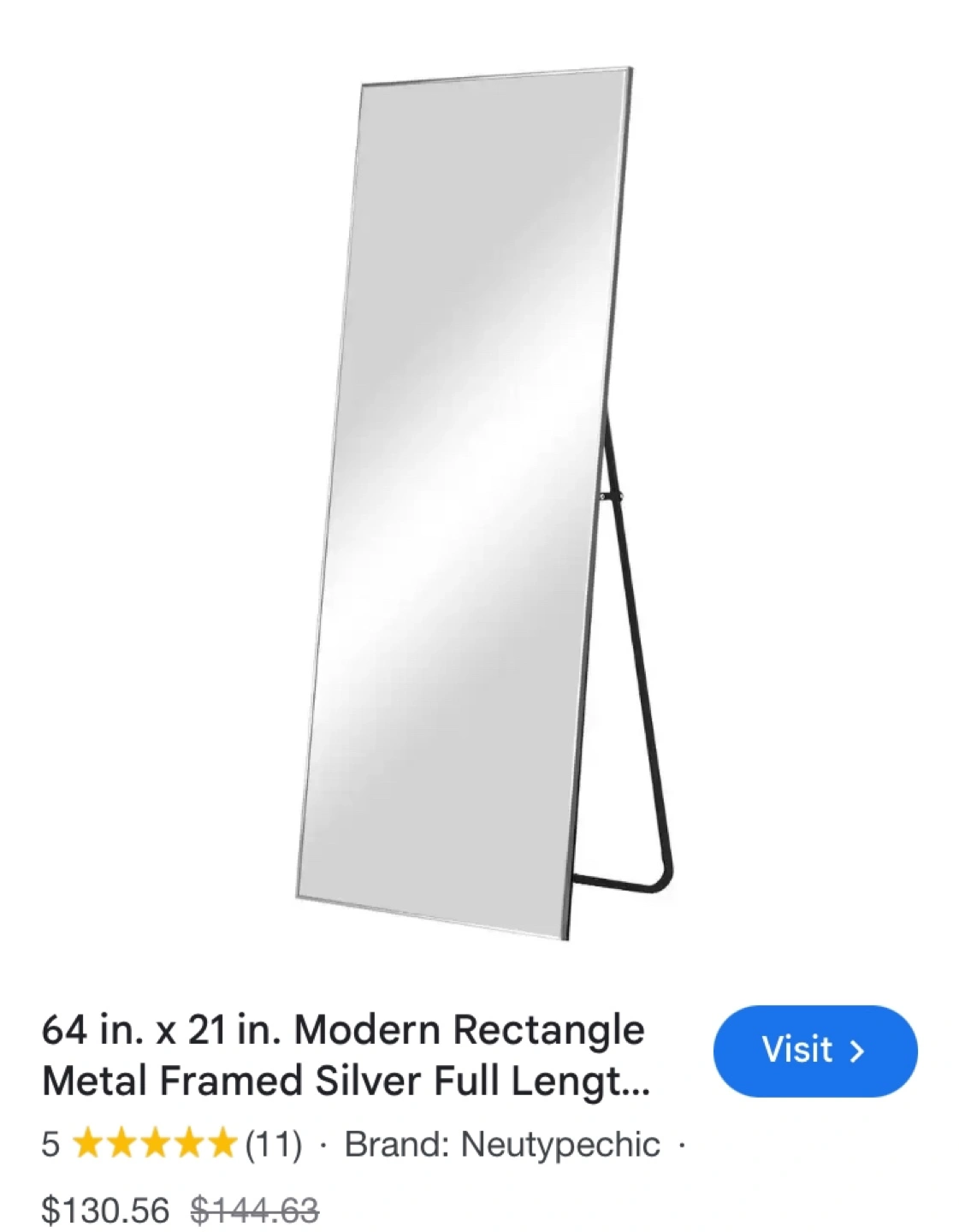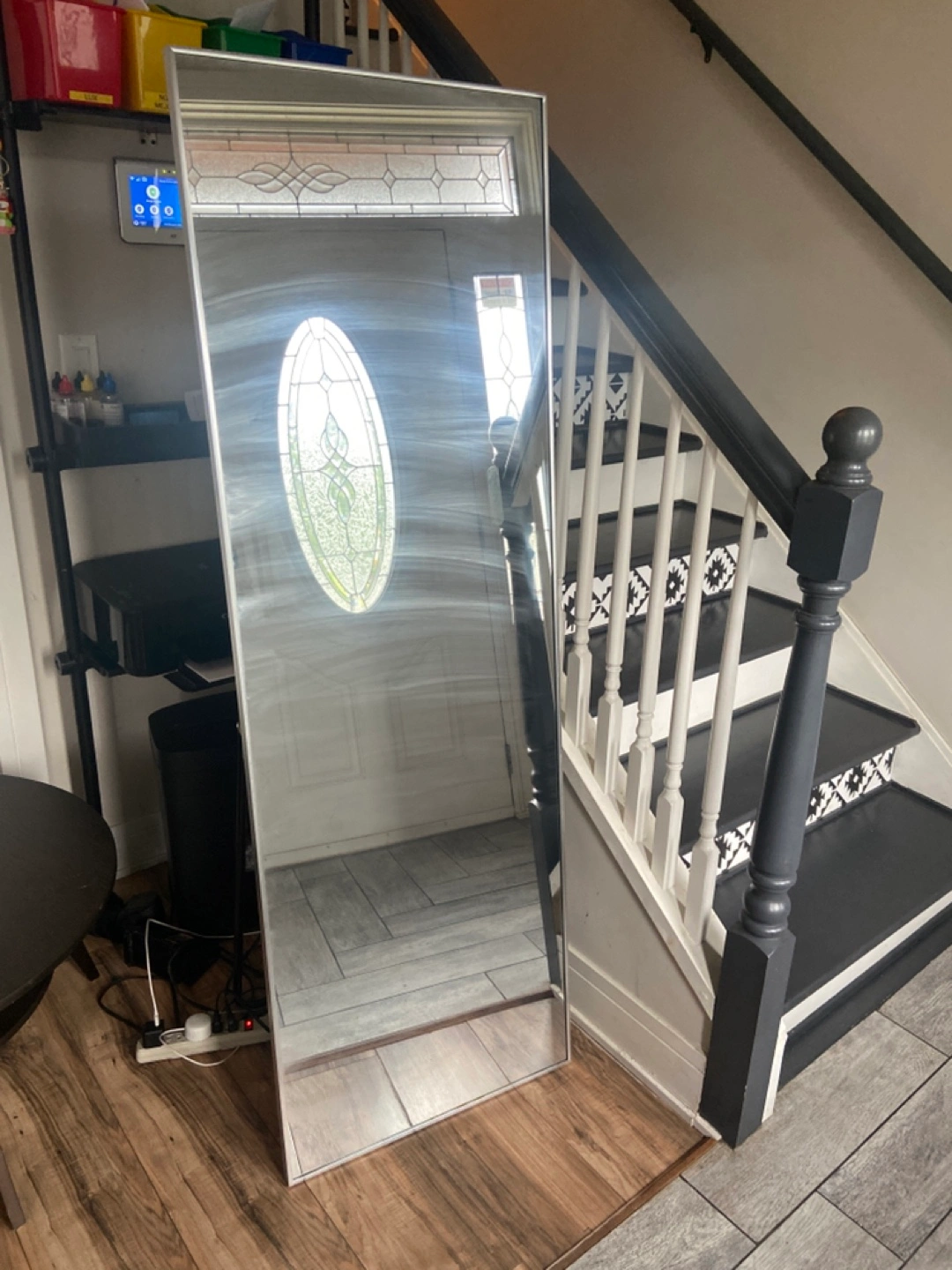 A full-length mirror that can be placed in your room for a great way to check your outfit before leaving for the day. Rectangular shape. Silver frame. Black stand.