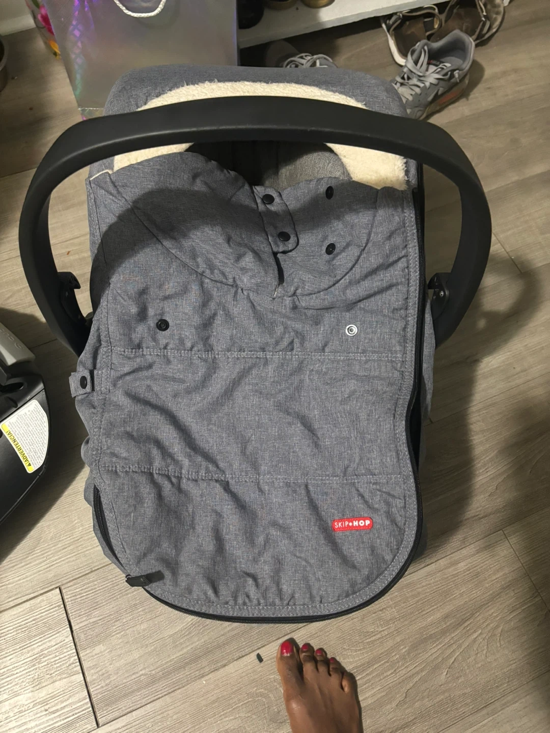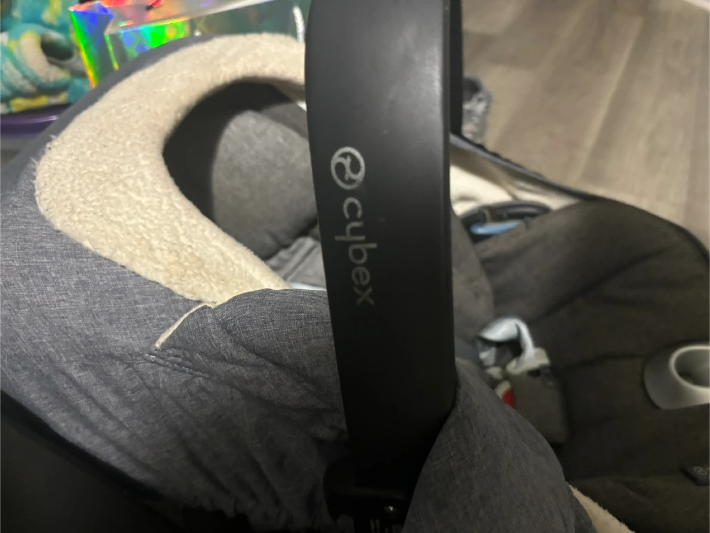 This is a Cybex infant car seat with its accompanying base. It's a gray and beige color. Includes infant padding for comfort.