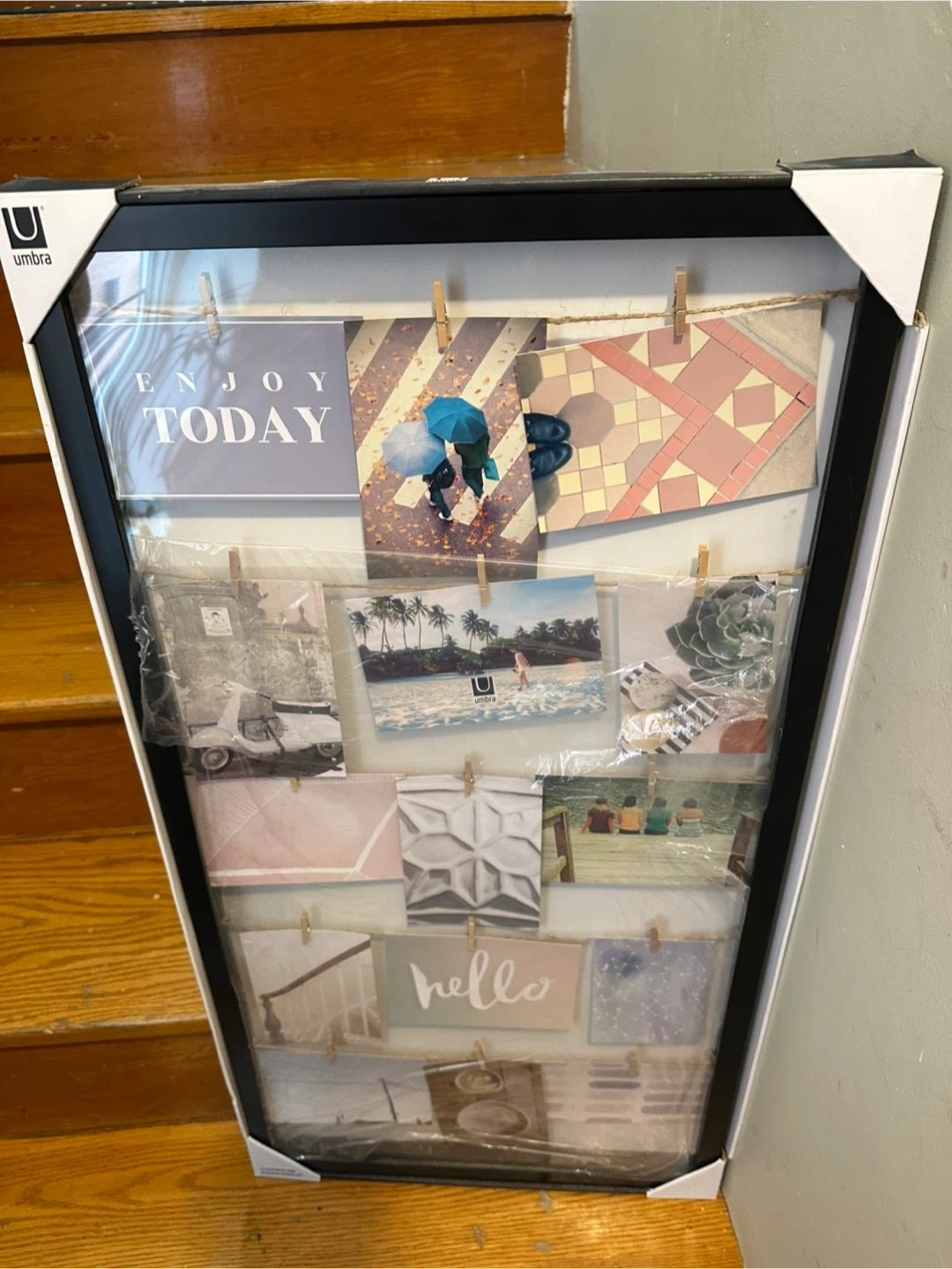 This is a black Umbra photo frame. It's designed to display multiple pictures on hanging strings with mini clothespins. It's a great way to showcase your favourite memories!