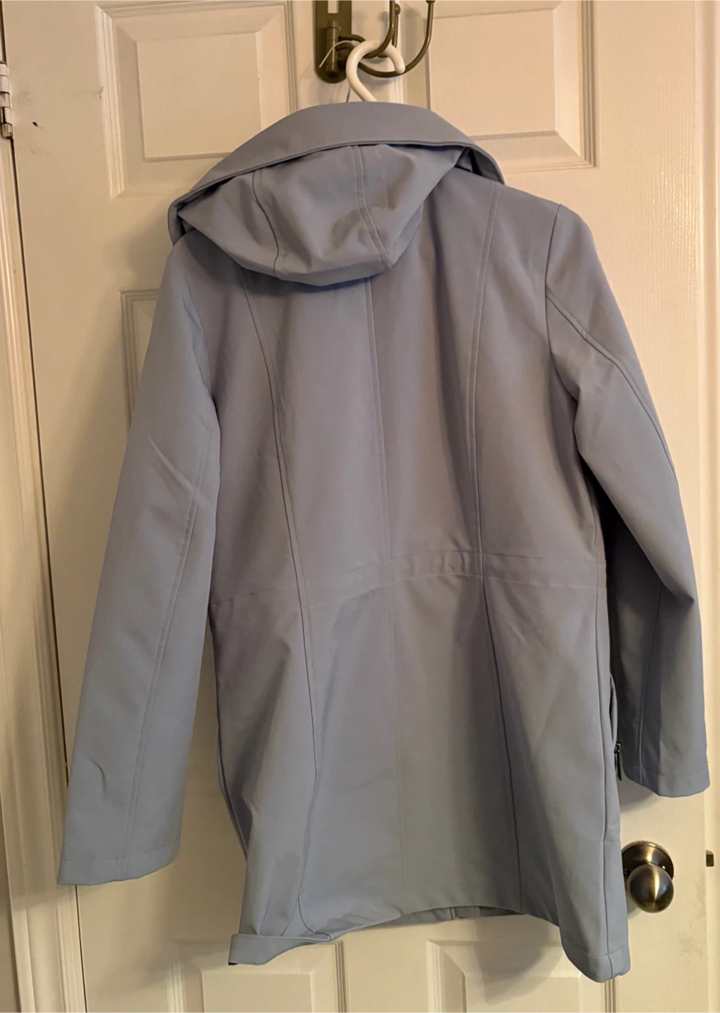 Selling a Calvin Klein water-resistant jacket. It's a light blue colour and features an adjustable hood. Perfect for those rainy days! Pick up is in Burlington.