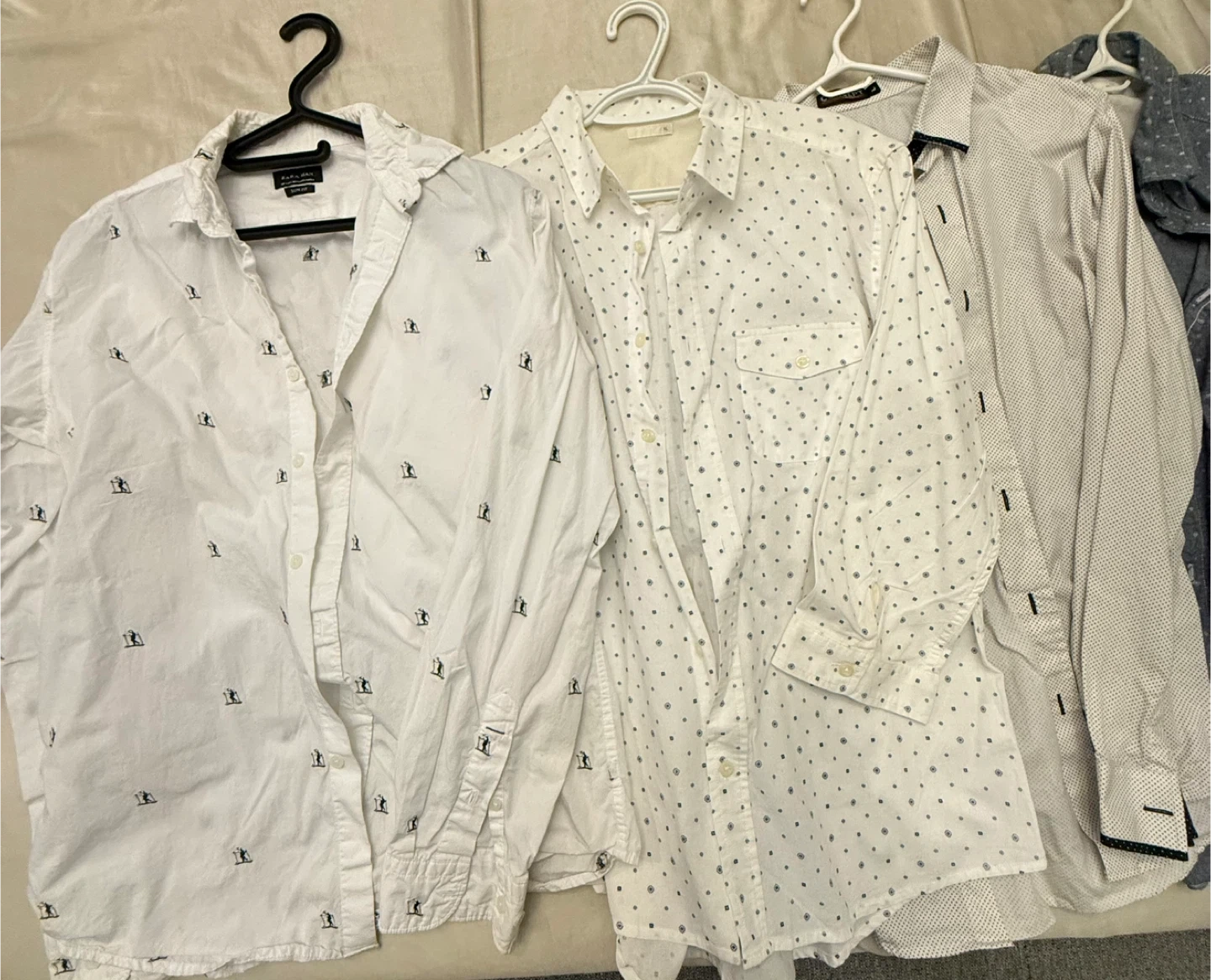Selling a lot of six men's dress shirts. There are various brands and patterns, including Zara and LSC. All are in good used condition and ready for a new wardrobe