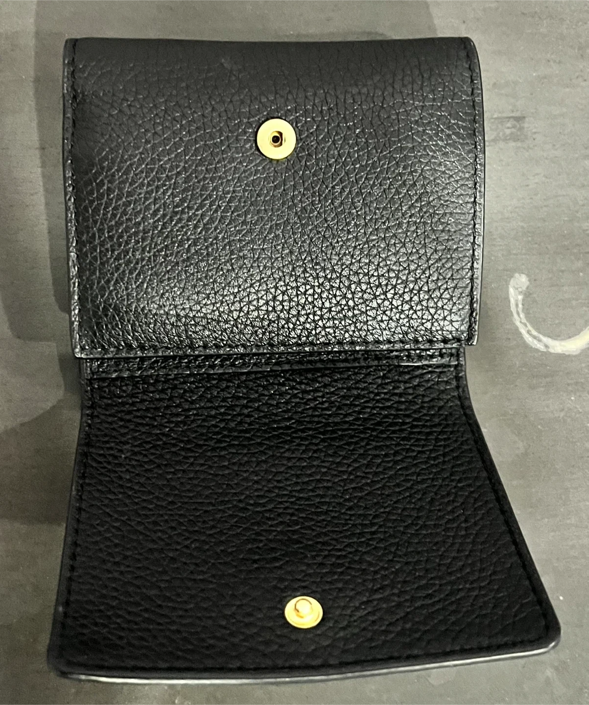 Black pebbled leather trifold wallet from Tory Burch. It features multiple card slots and a coin pocket. This compact wallet is perfect for everyday use!
