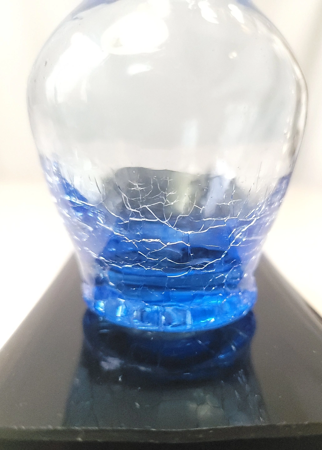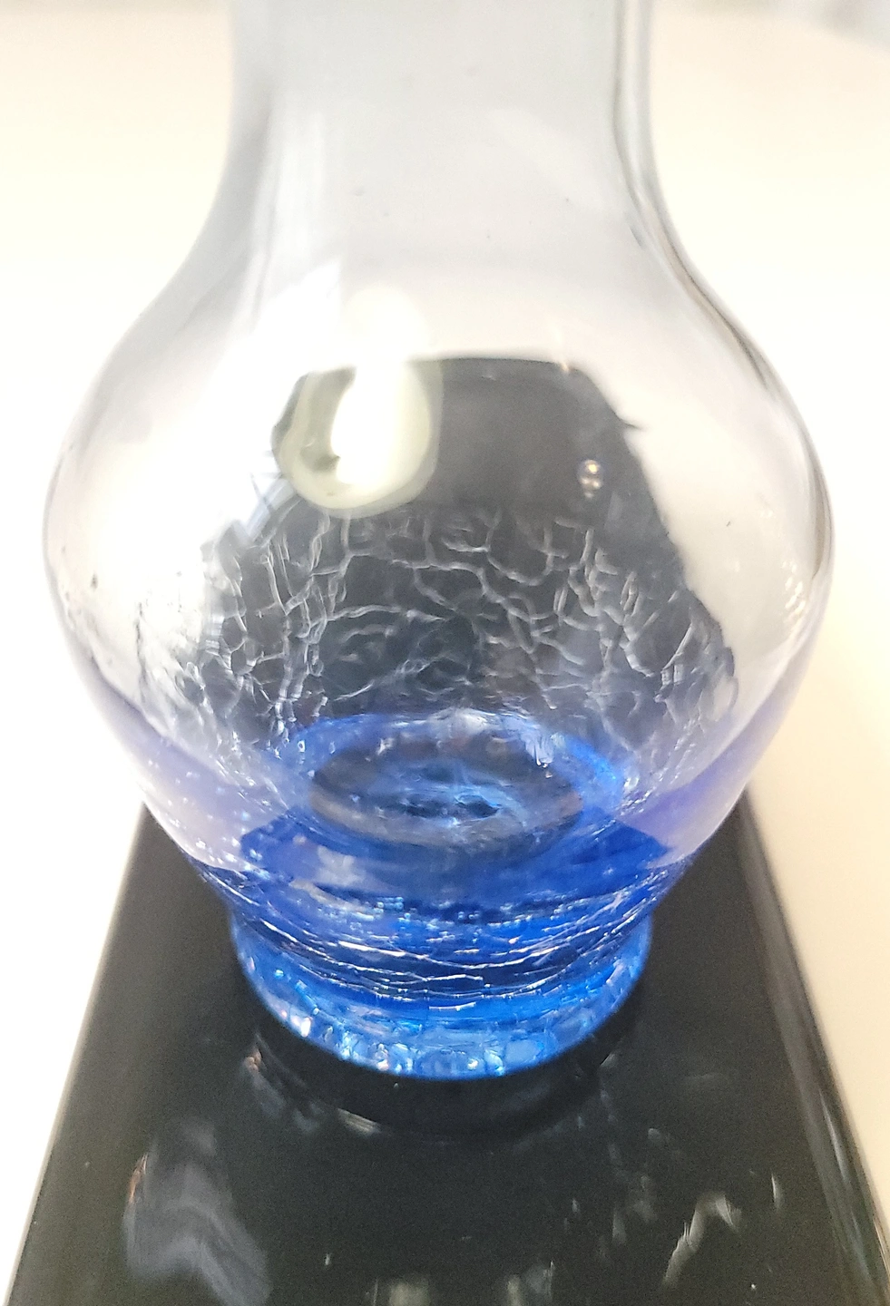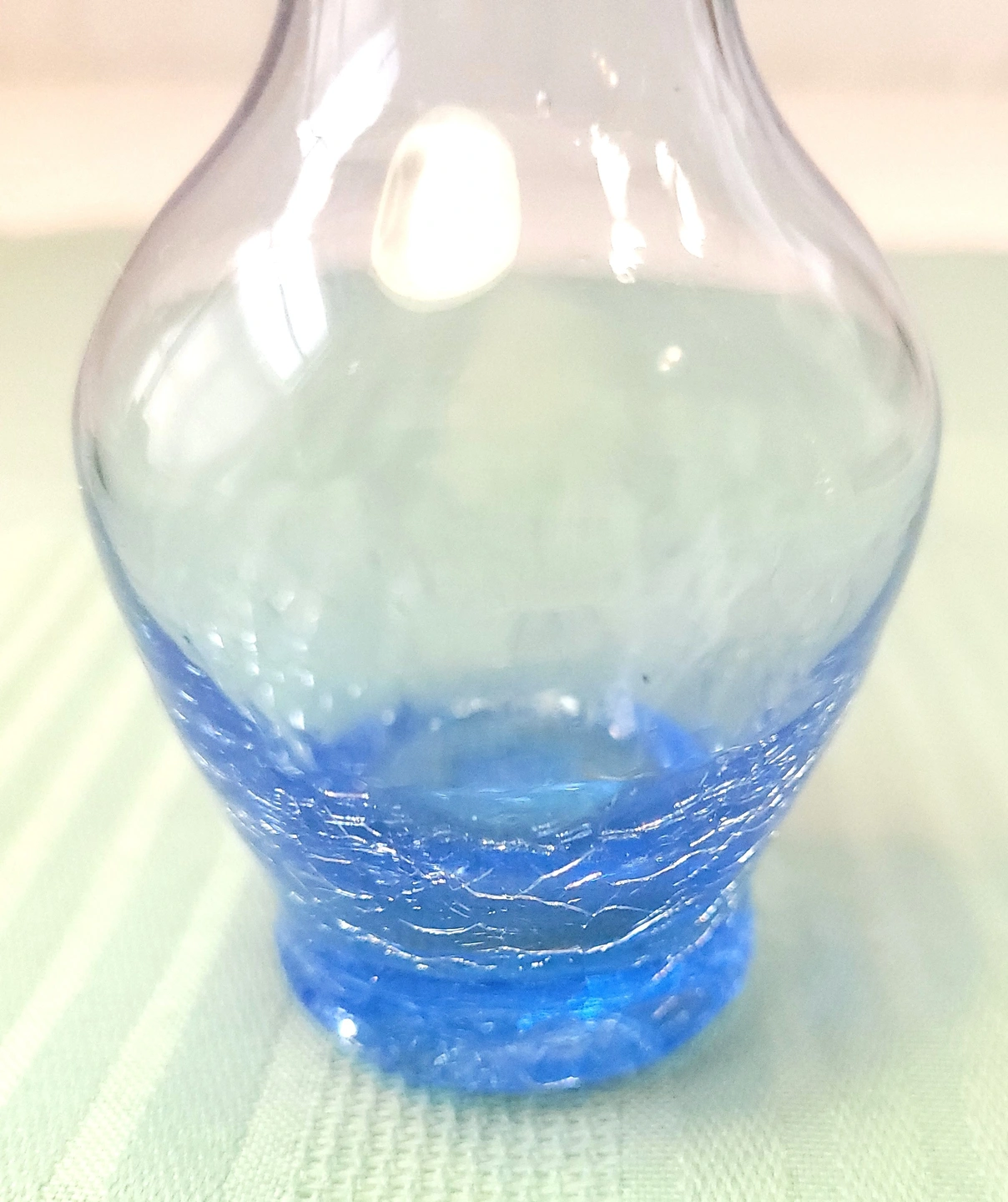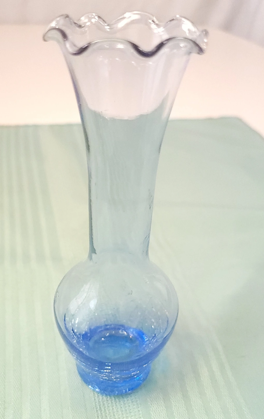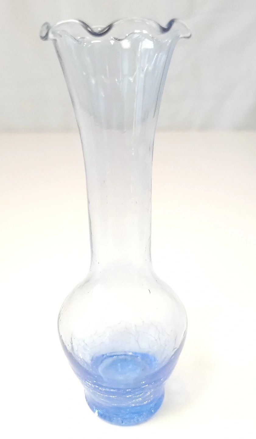 1960 Blue Crackle Glass Bud Vase 6" Ruffled Rim Hand Blown