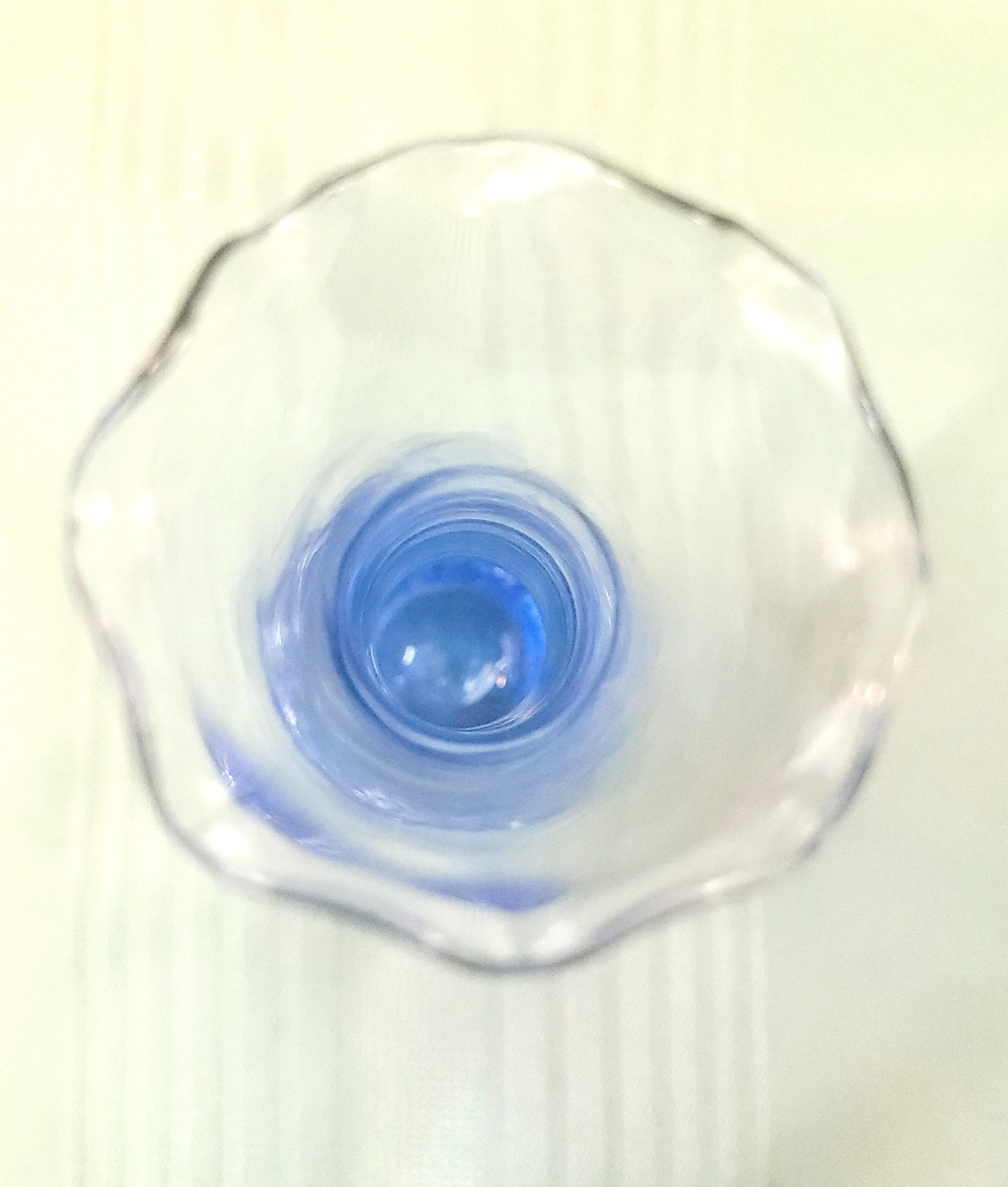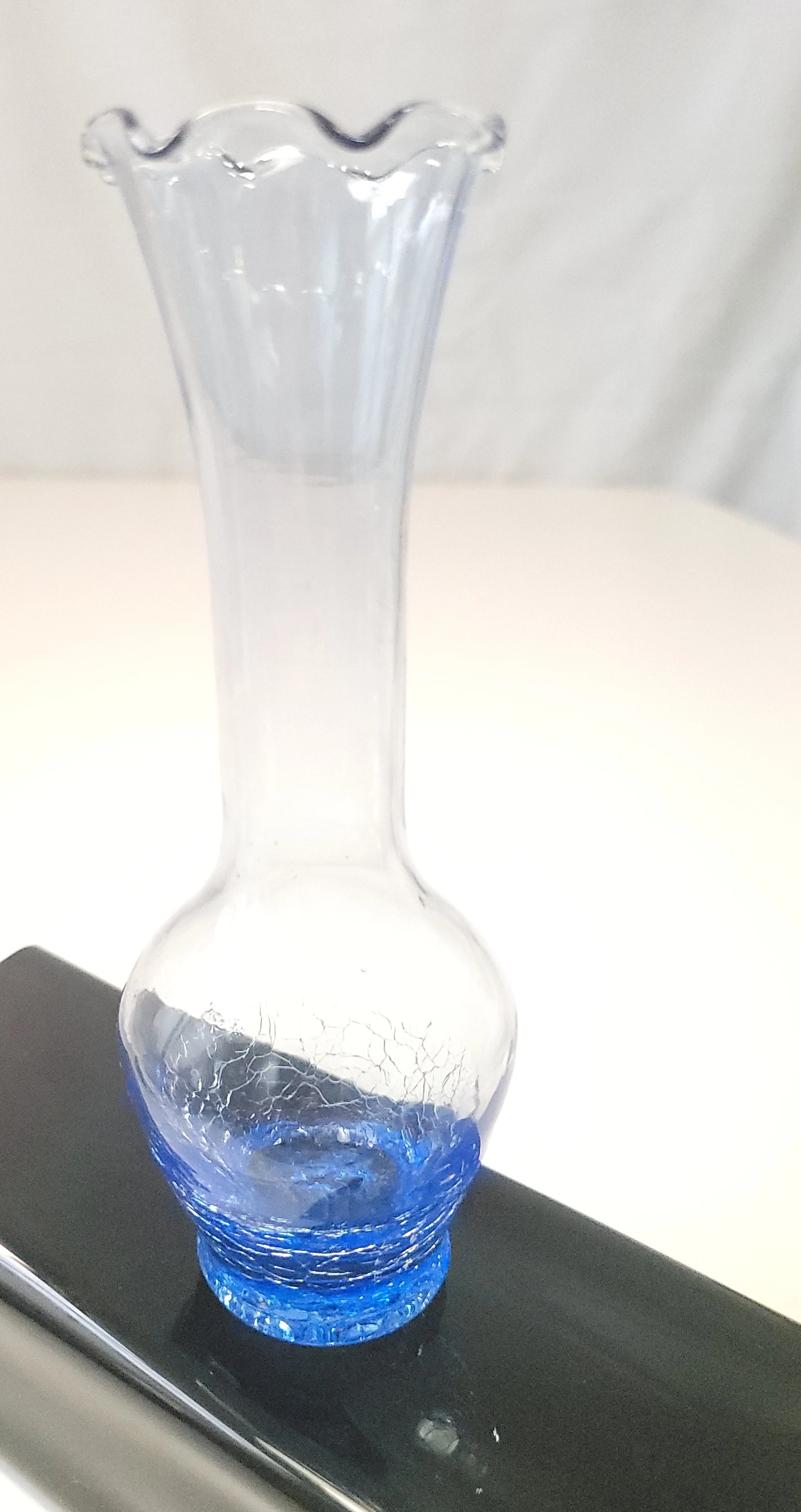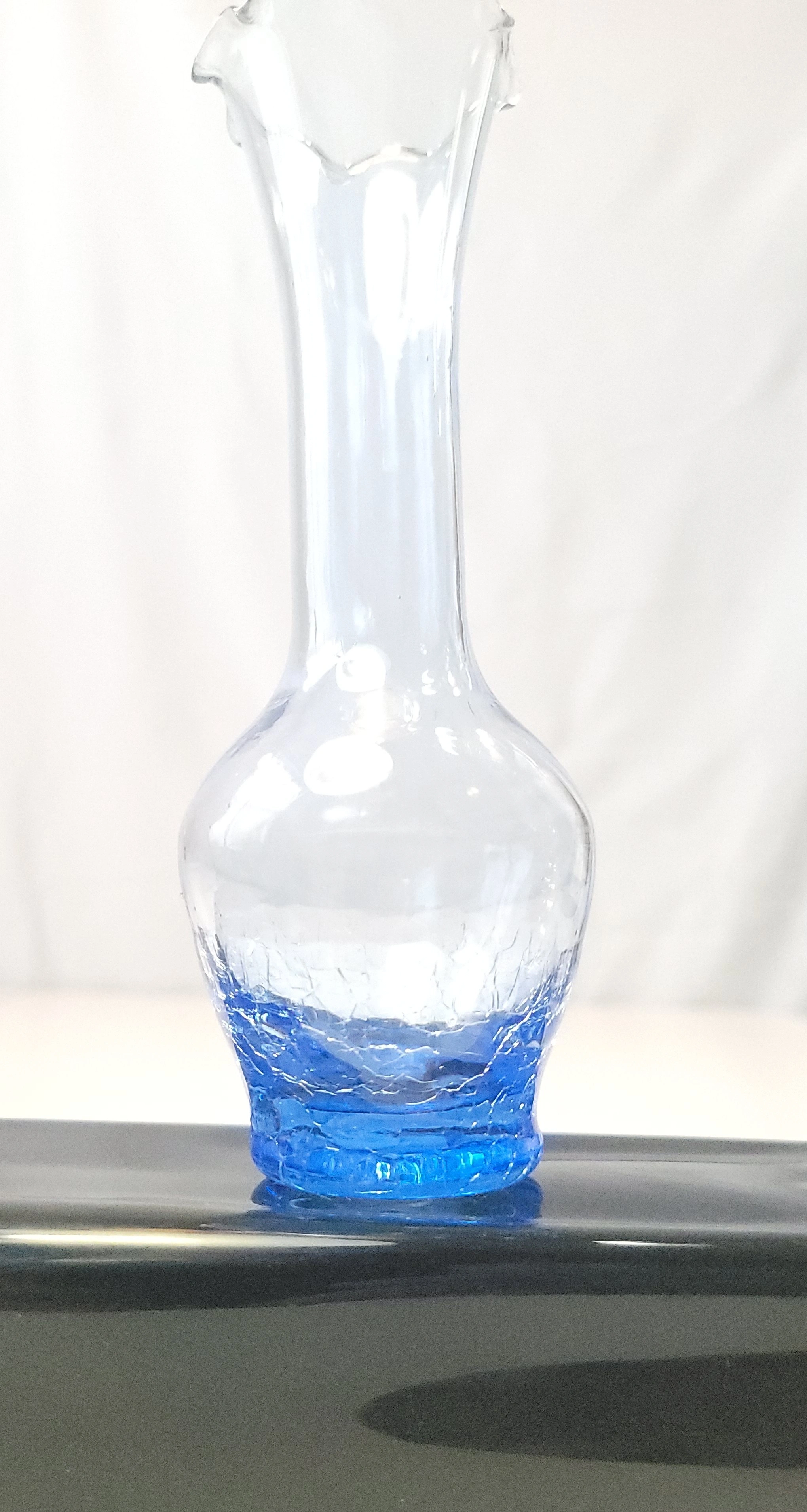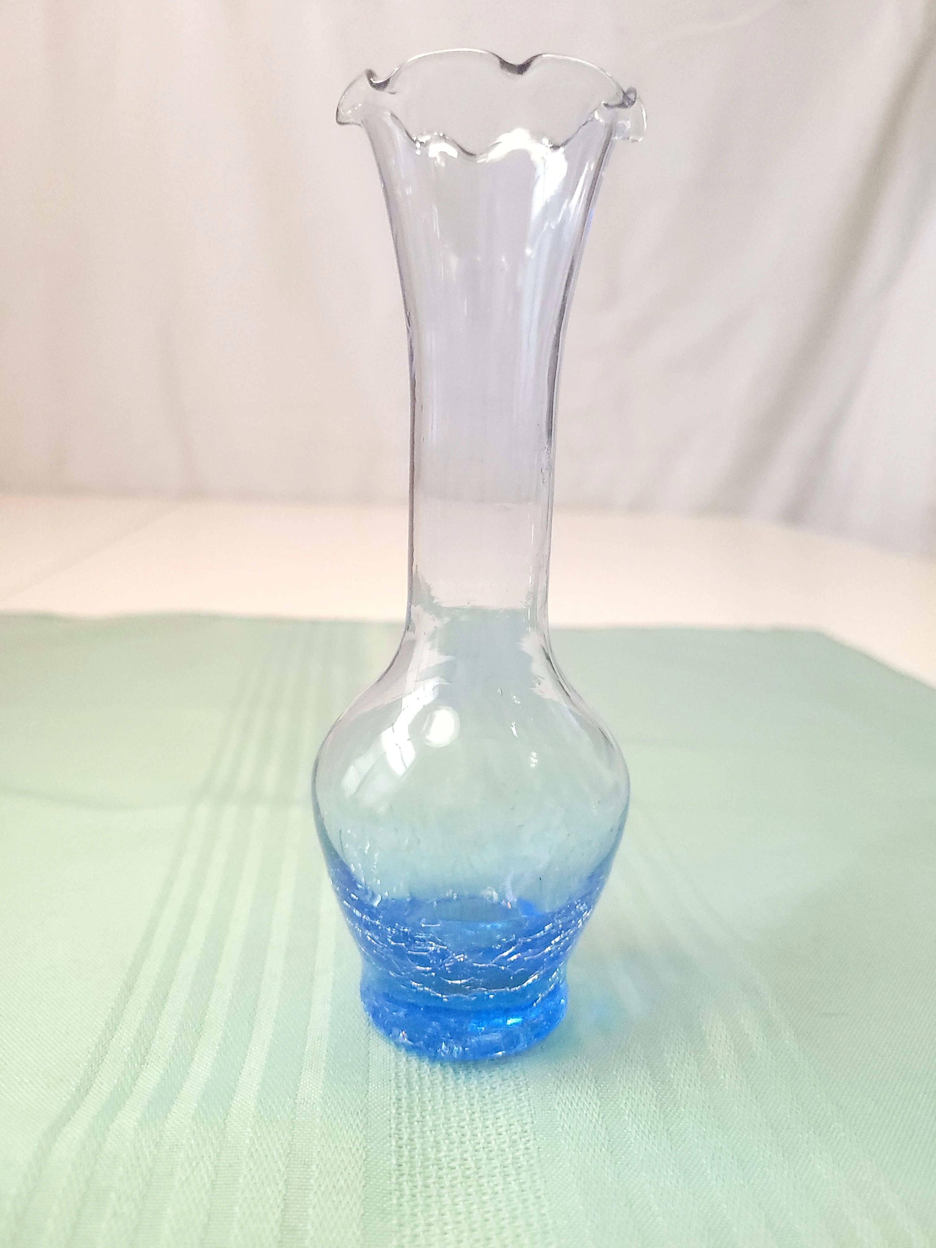 1960 Blue Crackle Glass Bud Vase 6" Ruffled Rim Hand Blown