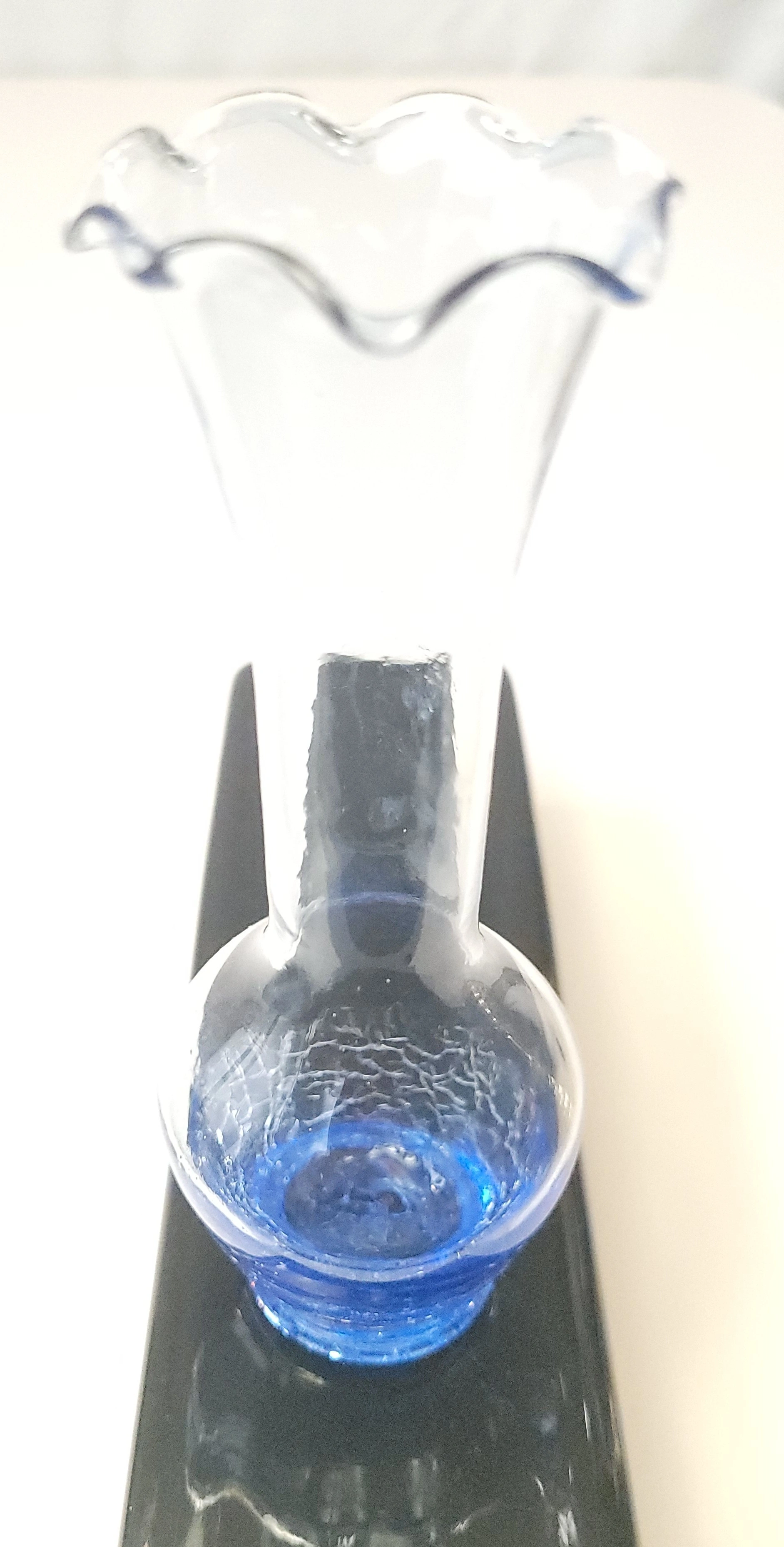 Beautiful Mid-Century Modern hand-blown crackle glass bud vase, attributed to Kanawha Glass. This piece features a striking cobalt blue base that transitions into a clear, tapered neck. The vase is finished with a classic six-point crimped (ruffled) rim and displays a distinct rough pontil mark on the base, authenticating its hand-blown origin.