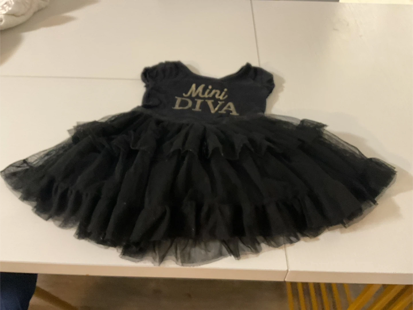 Black tutu dress with "Mini Diva" printed on the front. It's a playful and stylish piece for little ones. Made with a soft bodice and a full, ruffled tulle skirt.