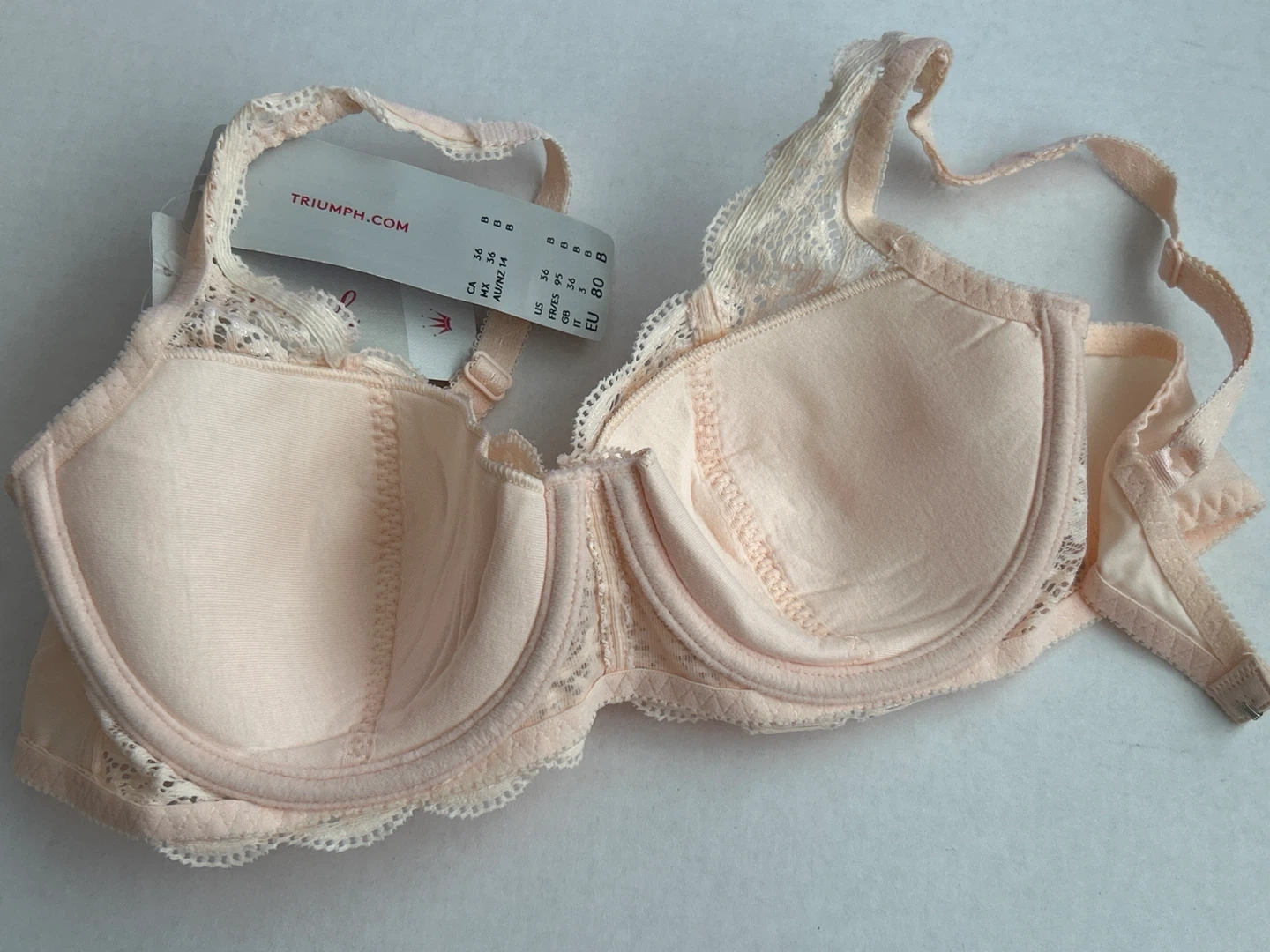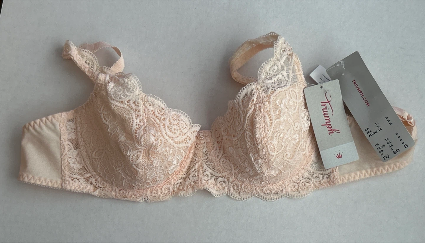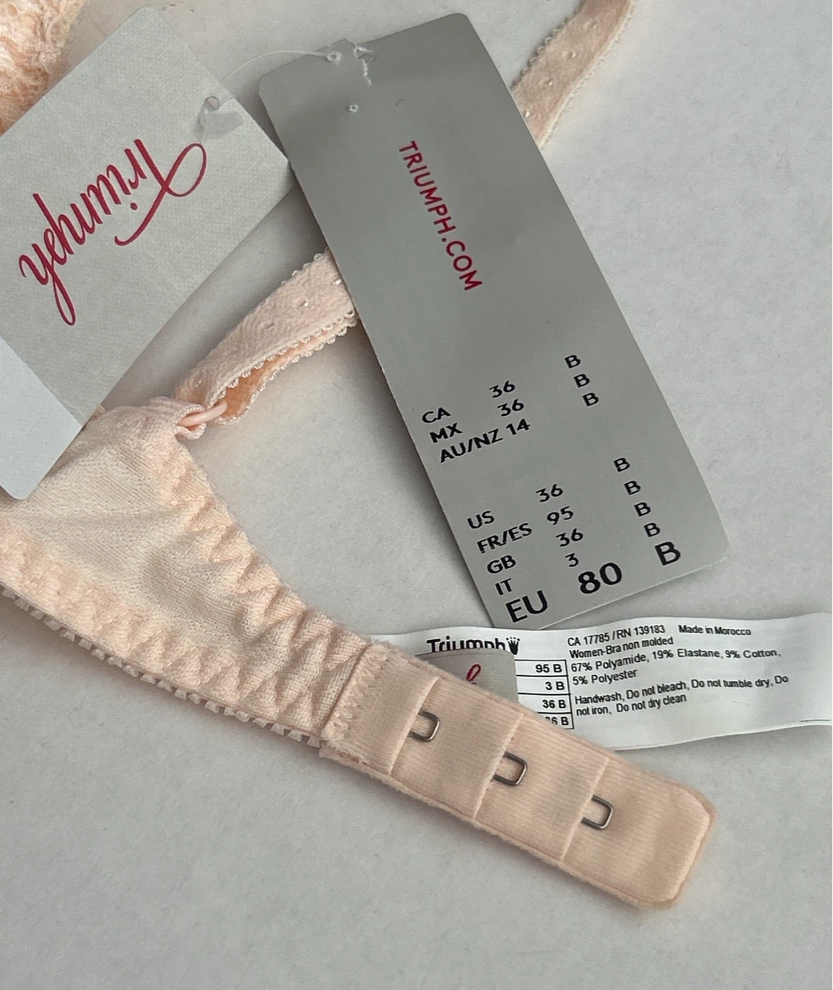 This is a brand new bra with tags - Triumph Amourette 300 WHP non-molded bra. It's made with 67% Polyamide, 19% Elastane, 9% Cotton, and 5% Polyester. Handwash only.