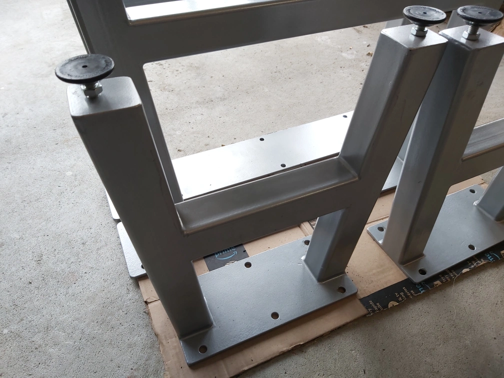 Set of 2 table legs and 2 bench legs for live edge tables and benches. Metal construction, silver painted finish. Square legs with a flat base. Feet have rubber pads.