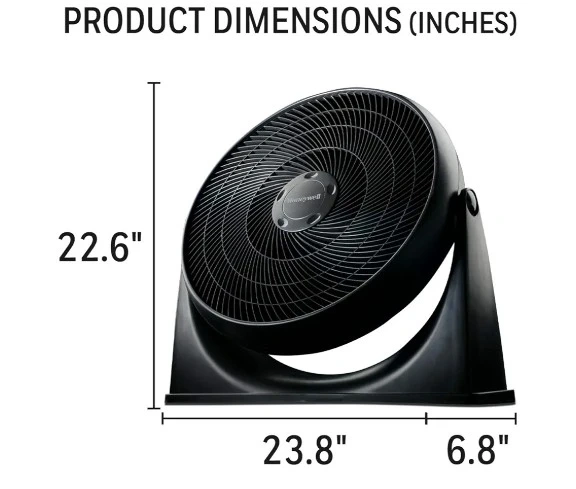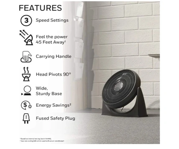 Honeywell Turbo Force Fan with 3 speed settings. It pivots 90 degrees and has a sturdy base. Feel the power 45 feet away. Features a carrying handle for easy transport.