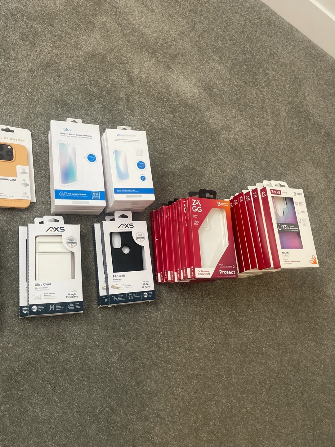 Bundle of various brand new cell phone cases and tempered glass screen protectors for iPhone, Samsung, and Motorola devices. Includes brands like Ideal of Sweden, AXS, ZAGG, and Blu element. All items are in original packaging.