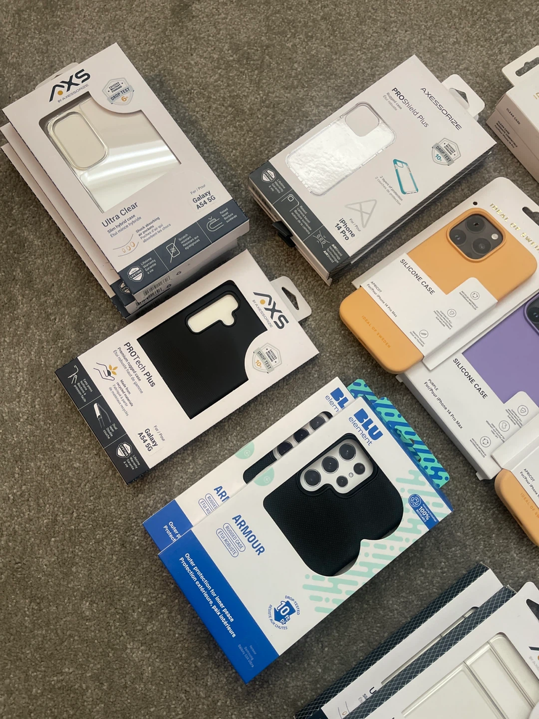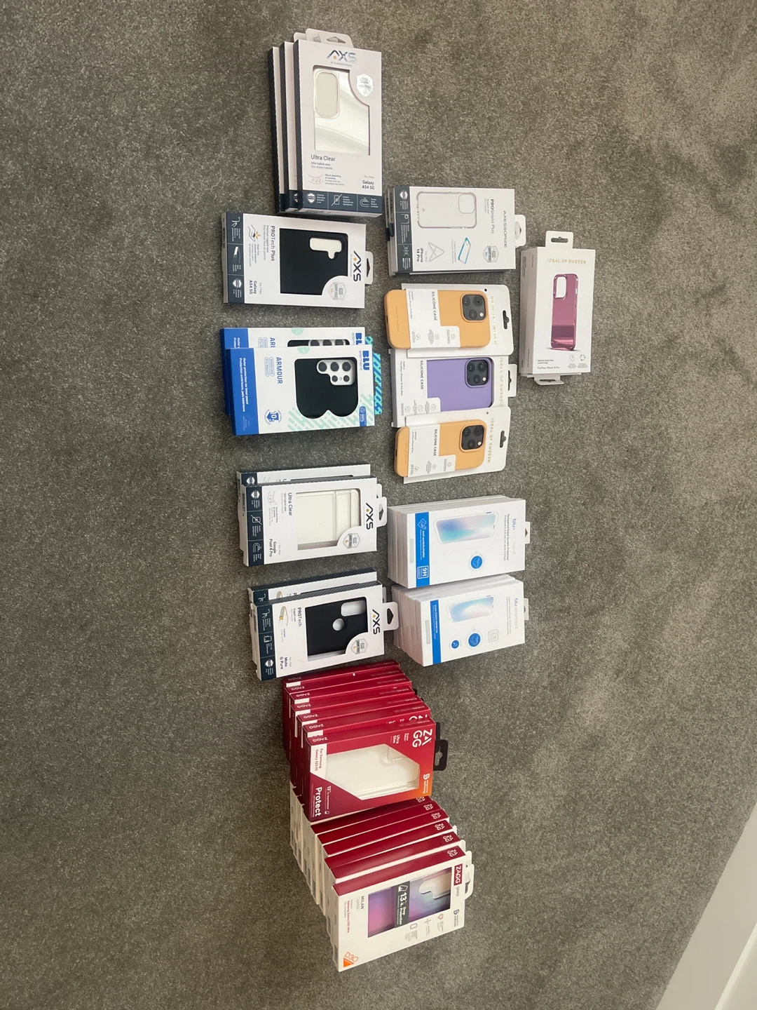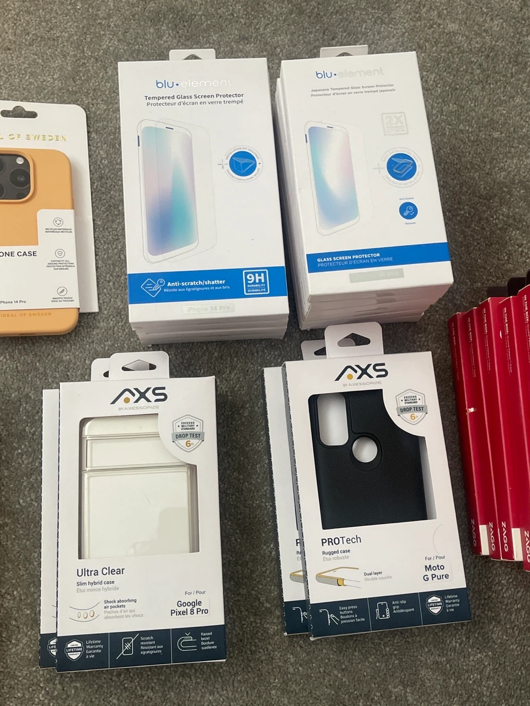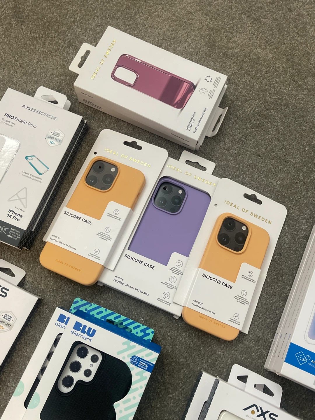 Bundle of various brand new cell phone cases and tempered glass screen protectors for iPhone, Samsung, and Motorola devices. Includes brands like Ideal of Sweden, AXS, ZAGG, and Blu element. All items are in original packaging.