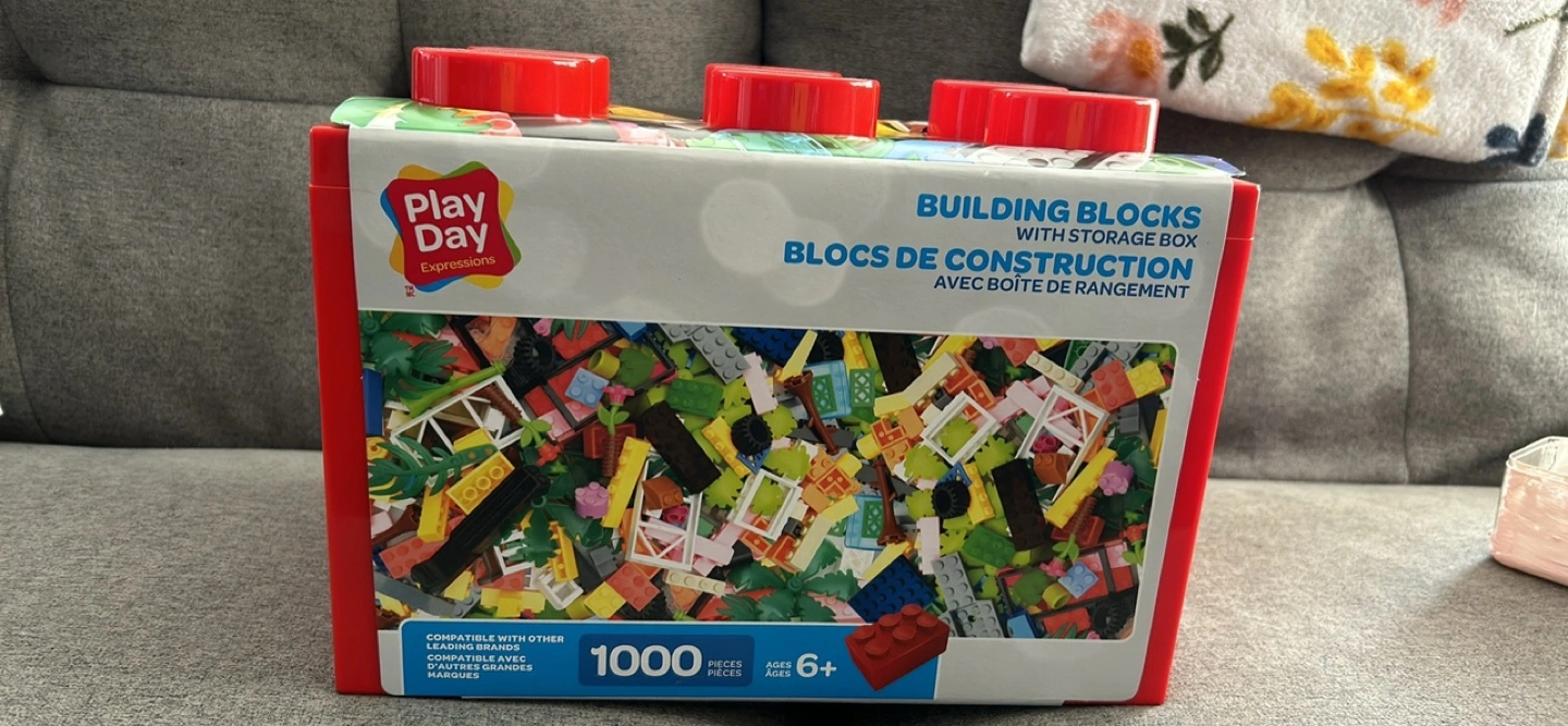 1000 piece building block set. Includes storage box and base plate. Compatible with other leading brands.