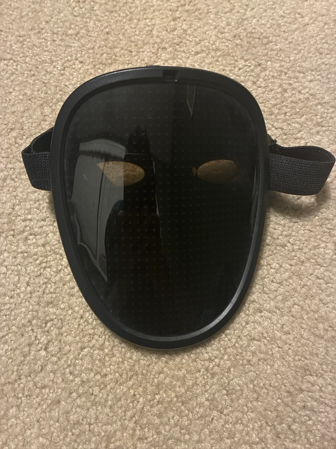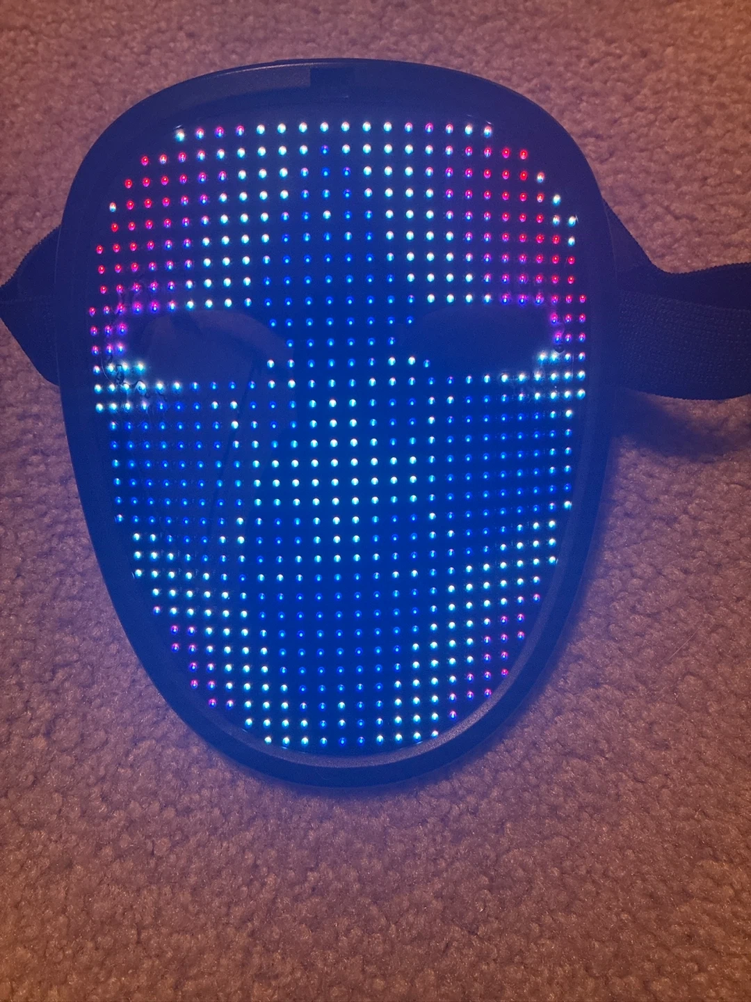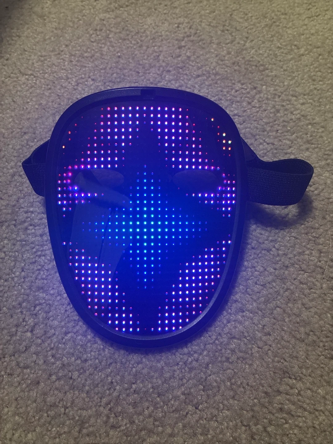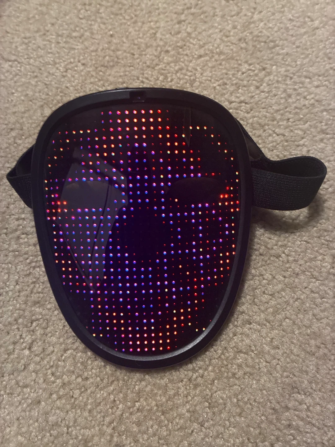 This LED mask displays colorful patterns and designs. It's lightweight and comes with a USB charging cable. The adjustable strap ensures a comfortable fit.
