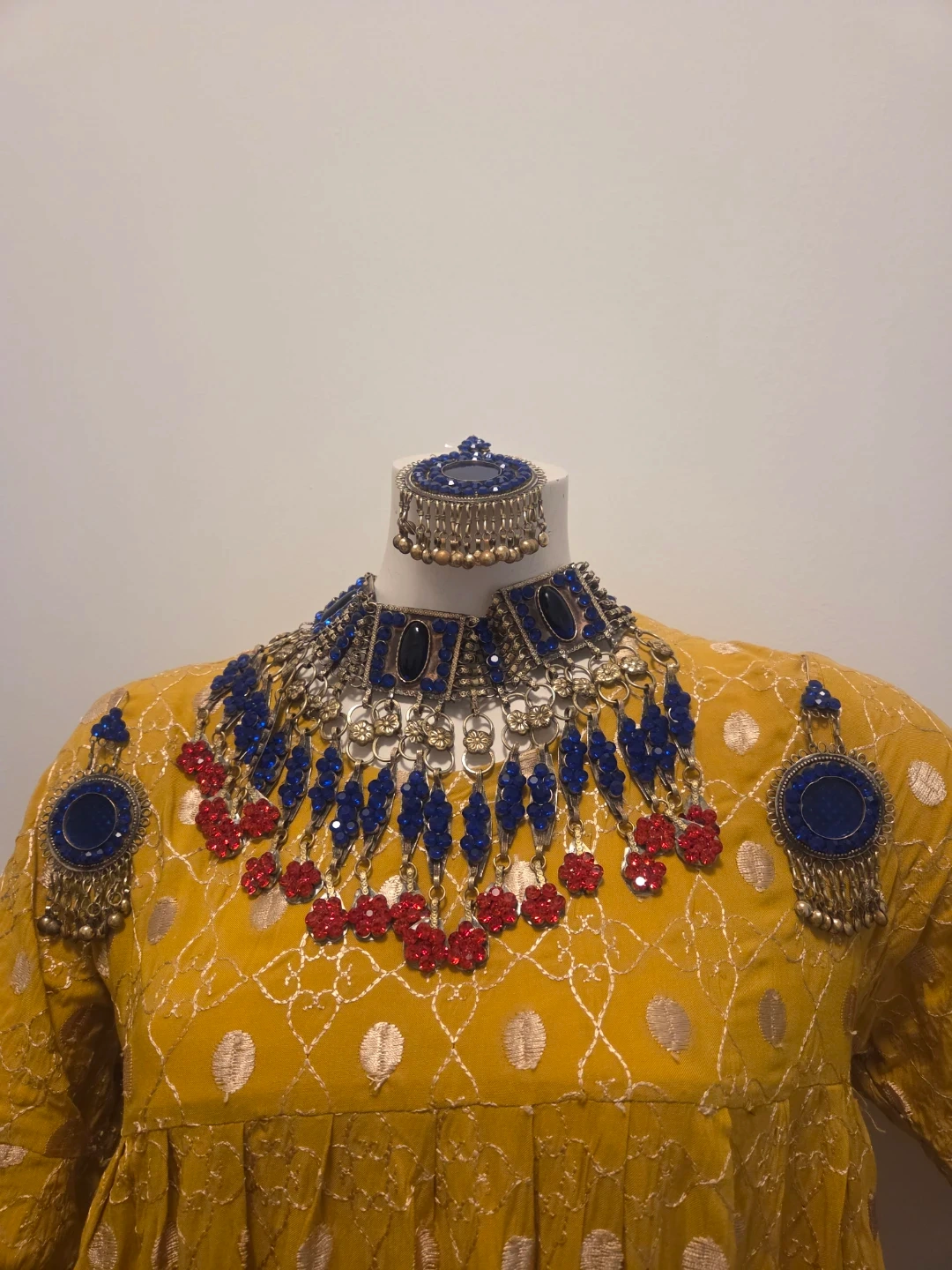 Beautiful matching set of necklace, headpiece, and earrings. The set features blue and red beads with silver accents. Perfect for adding a pop of colour to any outfit!