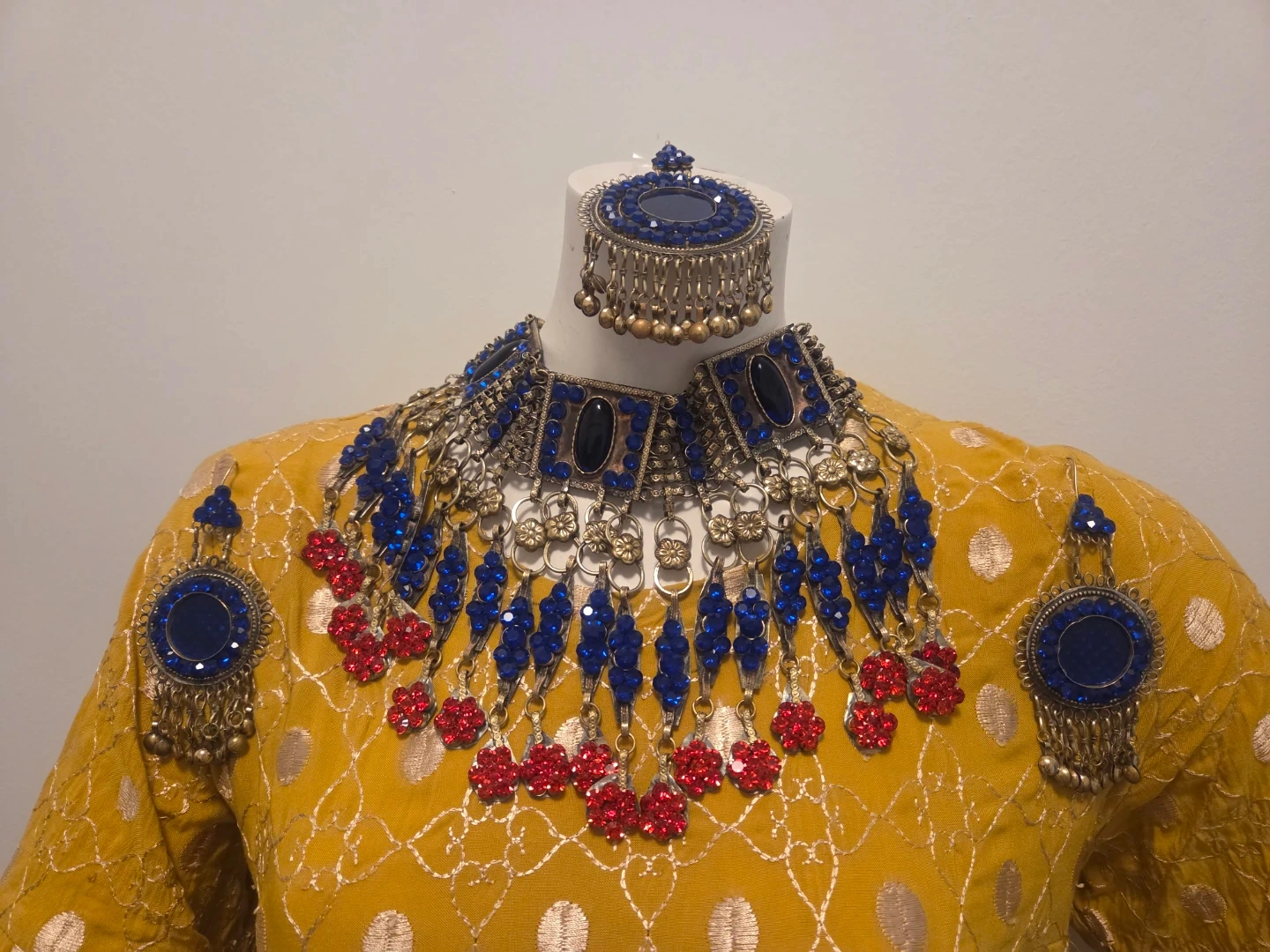 Beautiful matching set of necklace, headpiece, and earrings. The set features blue and red beads with silver accents. Perfect for adding a pop of colour to any outfit!