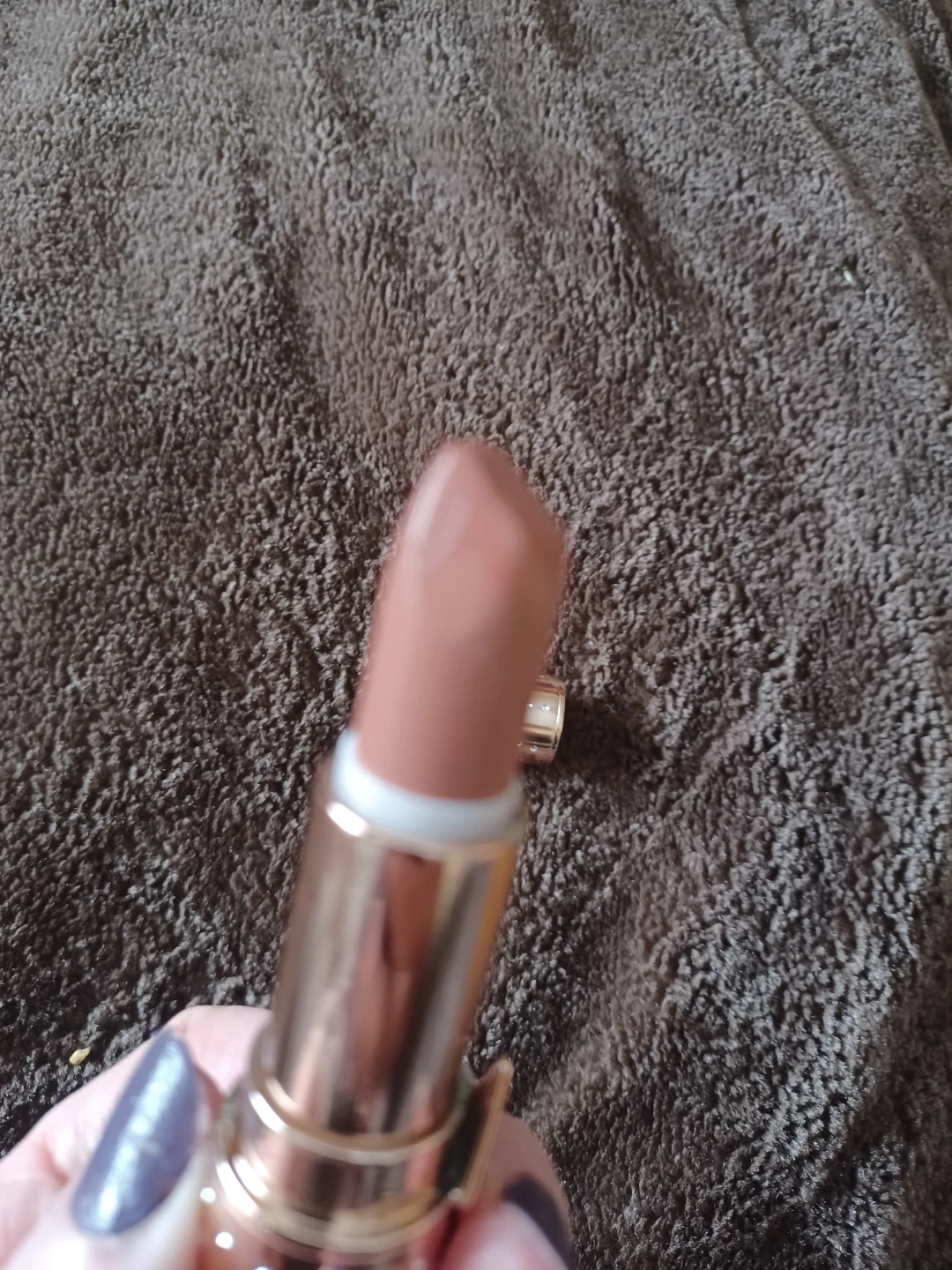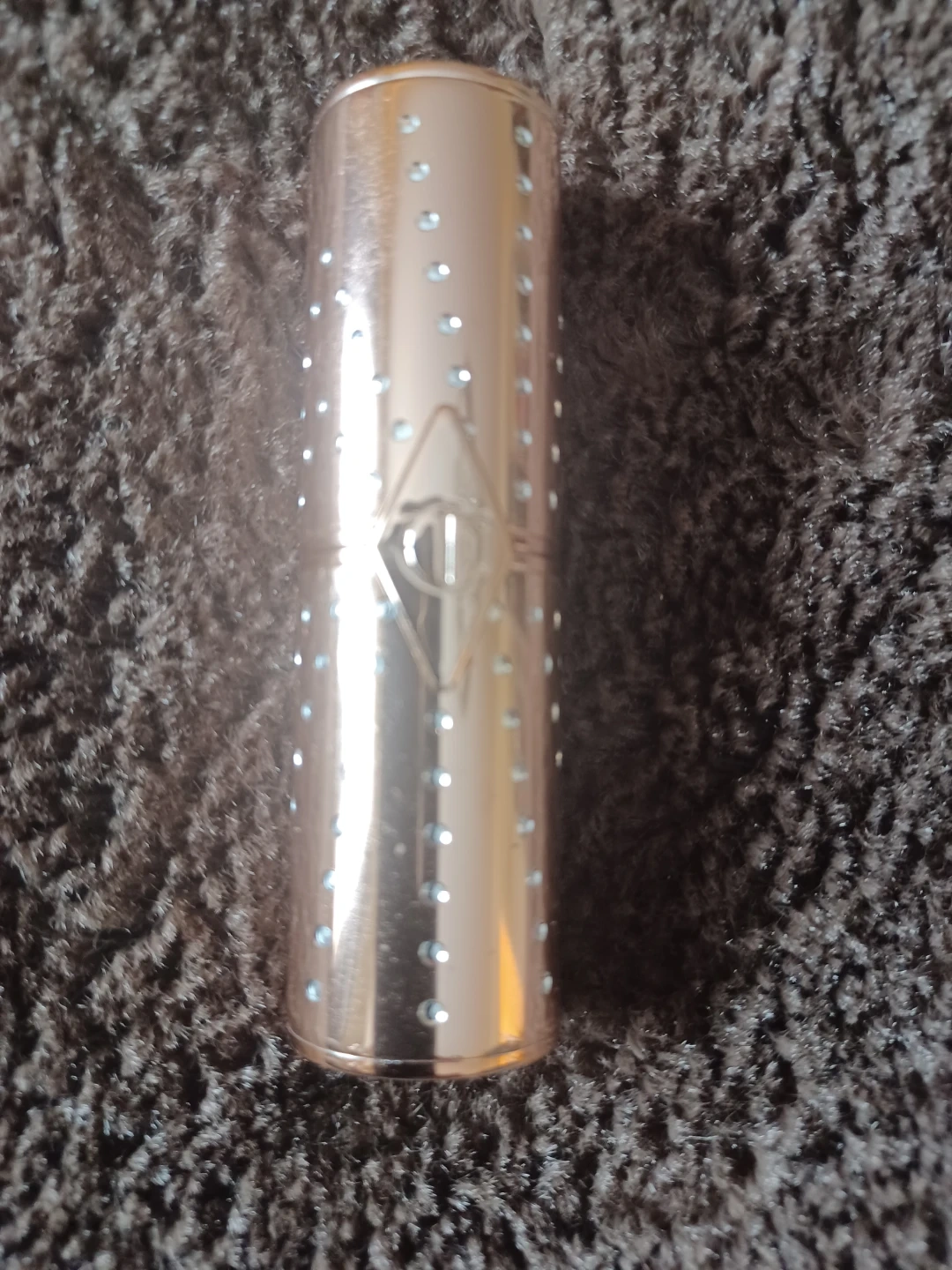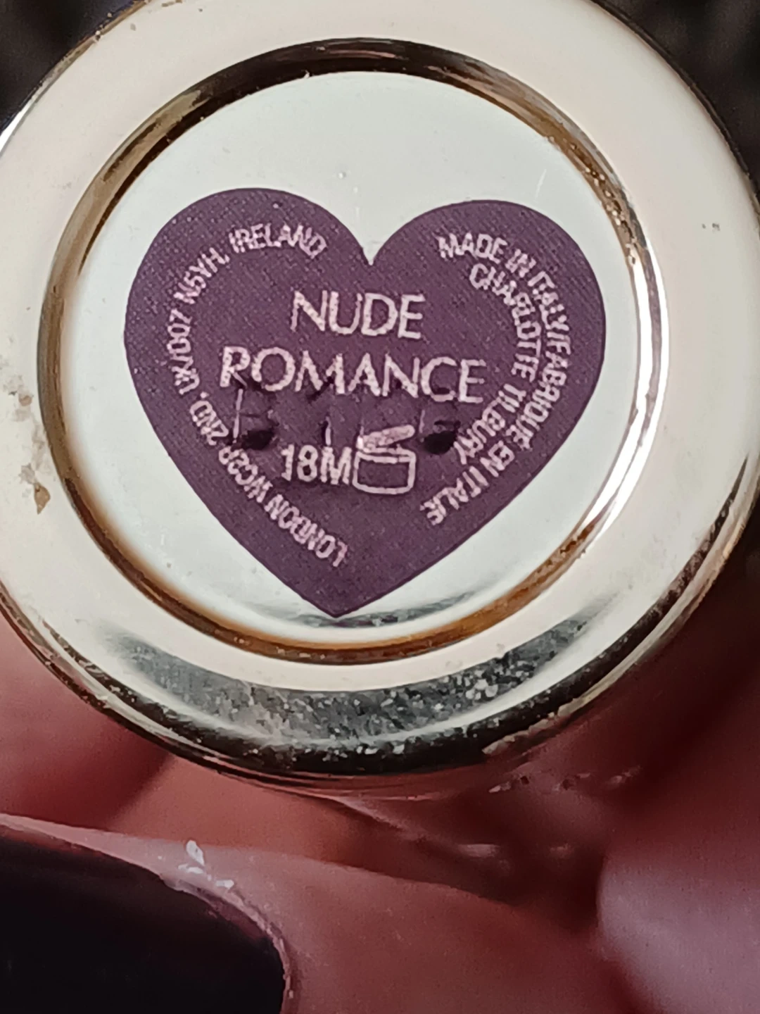Charlotte Tilbury lipstick in the shade Nude Romance. Made in Italy. The product has a 18-month shelf life after opening. Its rose gold packaging is embellished with rhinestones. Have used x 2 but not a good shade for me. Retails at saphora for 53$ plus tax