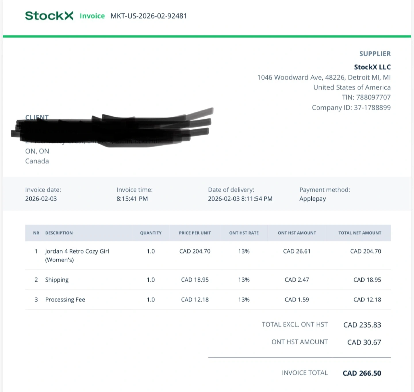 Comes with online receipt