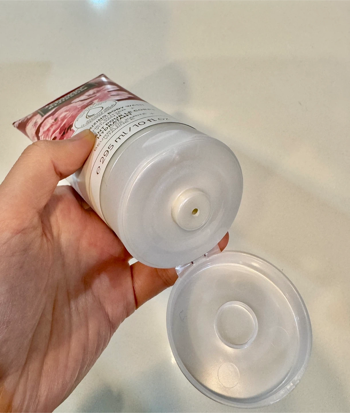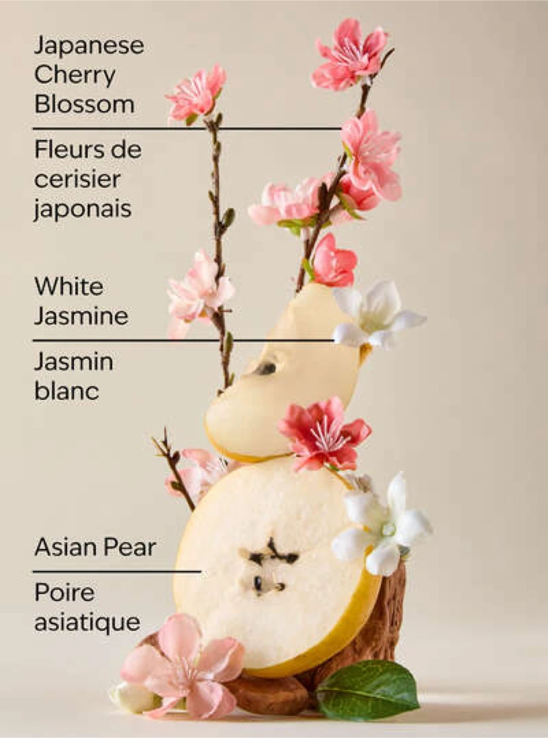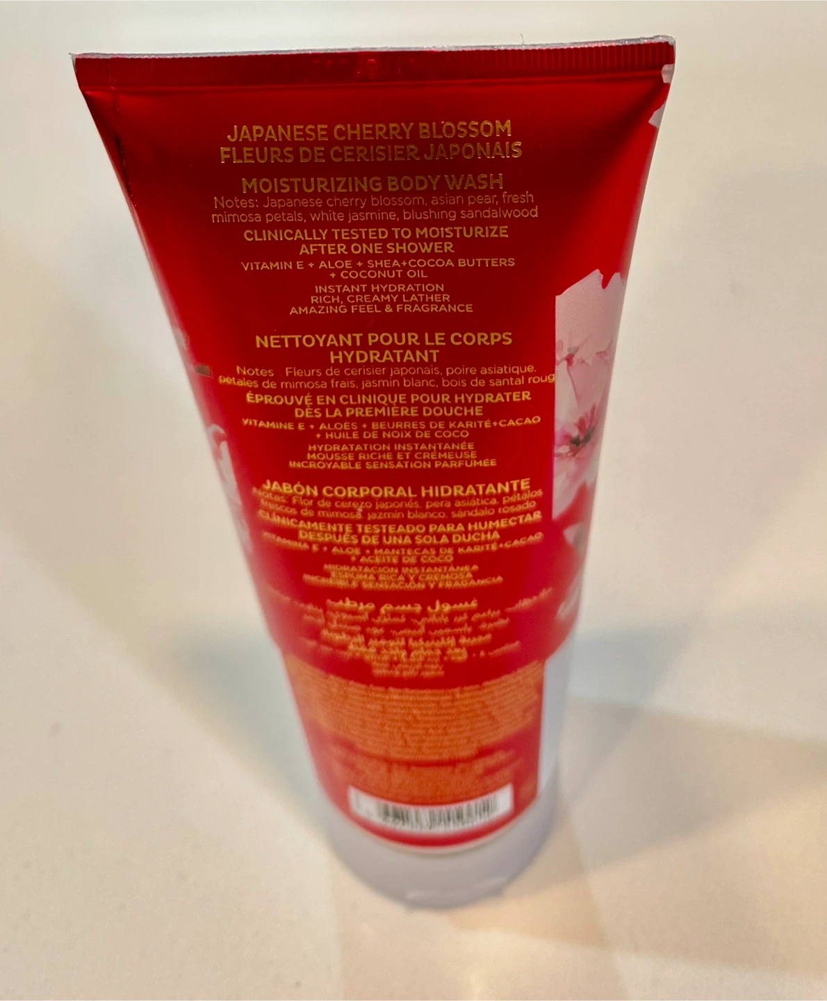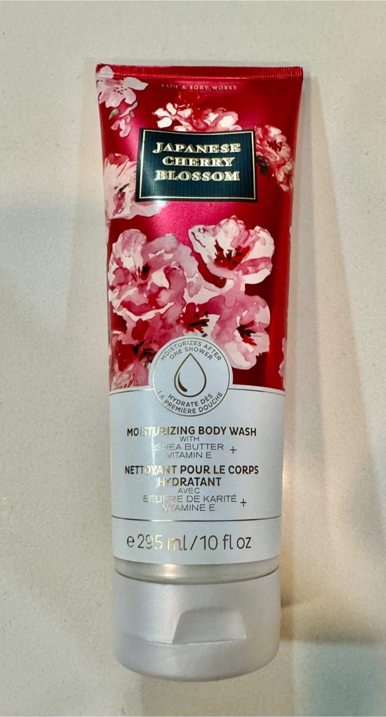 This is a Bath & Body Works Japanese Cherry Blossom Moisturizing Body Wash. It contains shea butter and Vitamin E. It's a 295 mL / 10 fl oz bottle. The notes are Japanese cherry blossom, Asian pear, fresh mimosa petals, white jasmine, and blushing sandalwood.