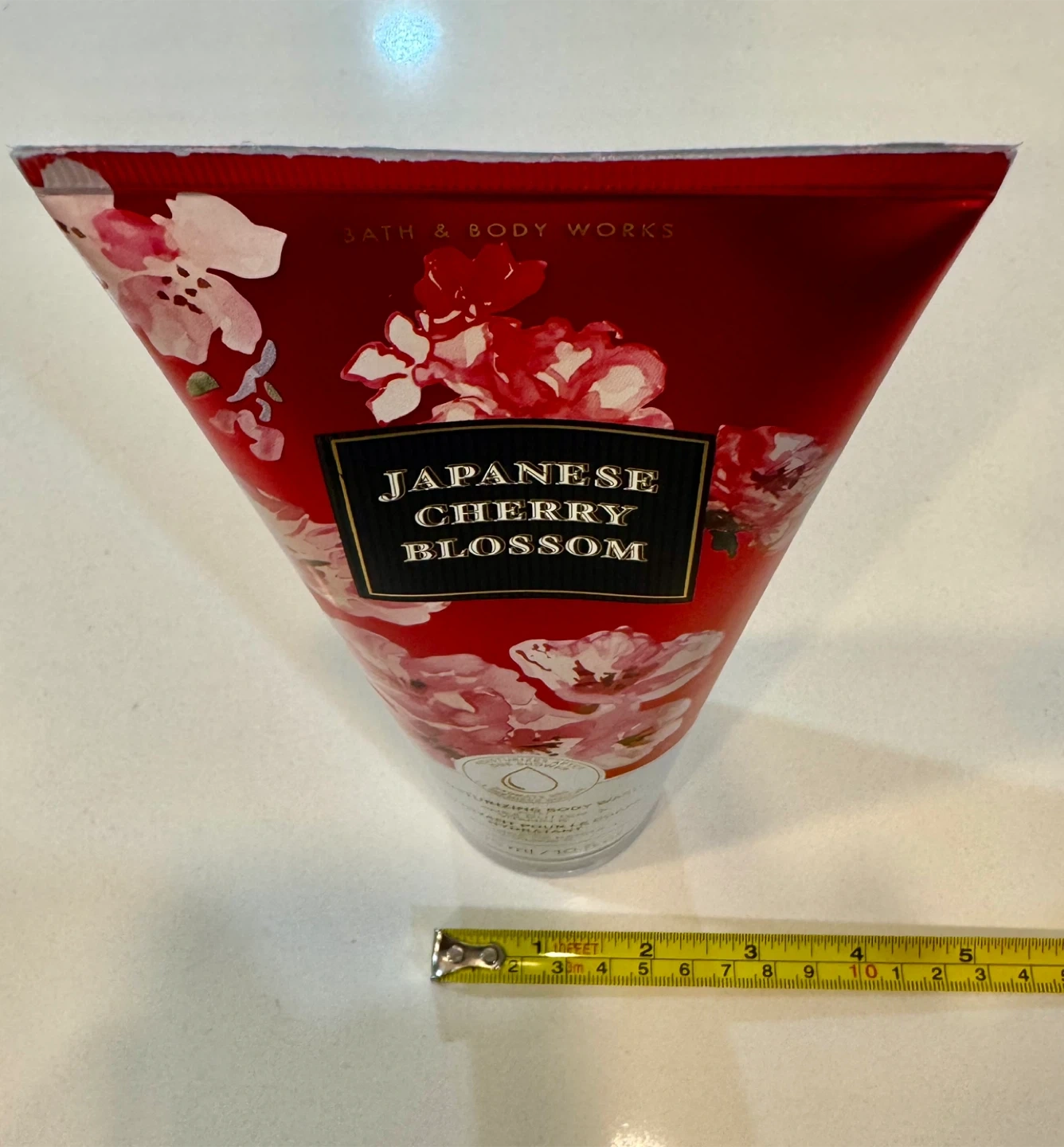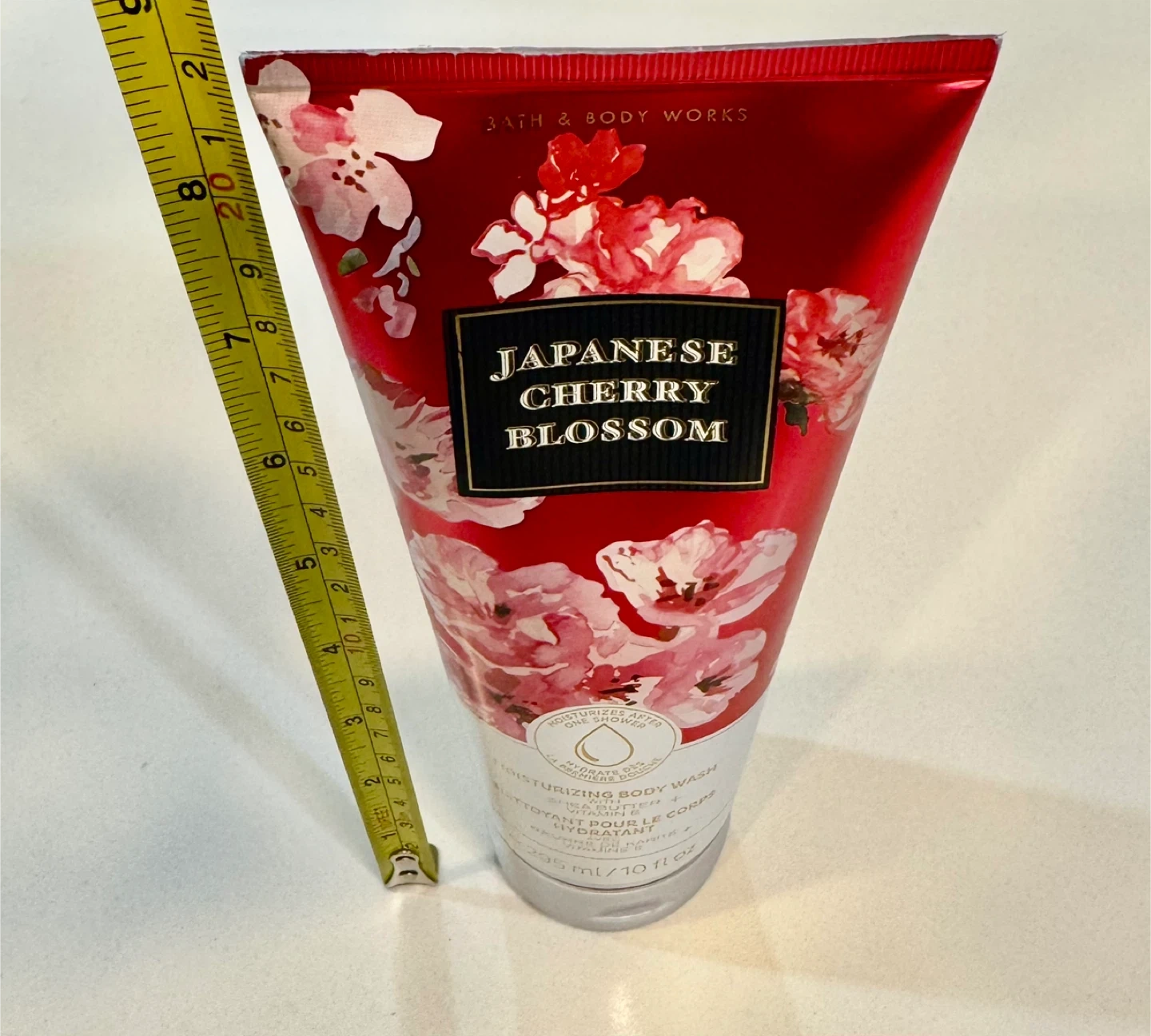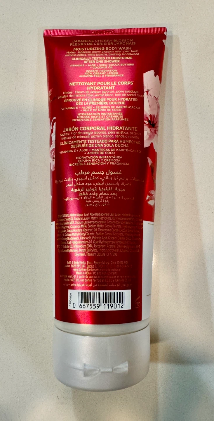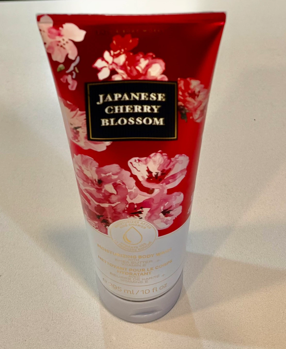 This is a Bath & Body Works Japanese Cherry Blossom Moisturizing Body Wash. It contains shea butter and Vitamin E. It's a 295 mL / 10 fl oz bottle. The notes are Japanese cherry blossom, Asian pear, fresh mimosa petals, white jasmine, and blushing sandalwood.