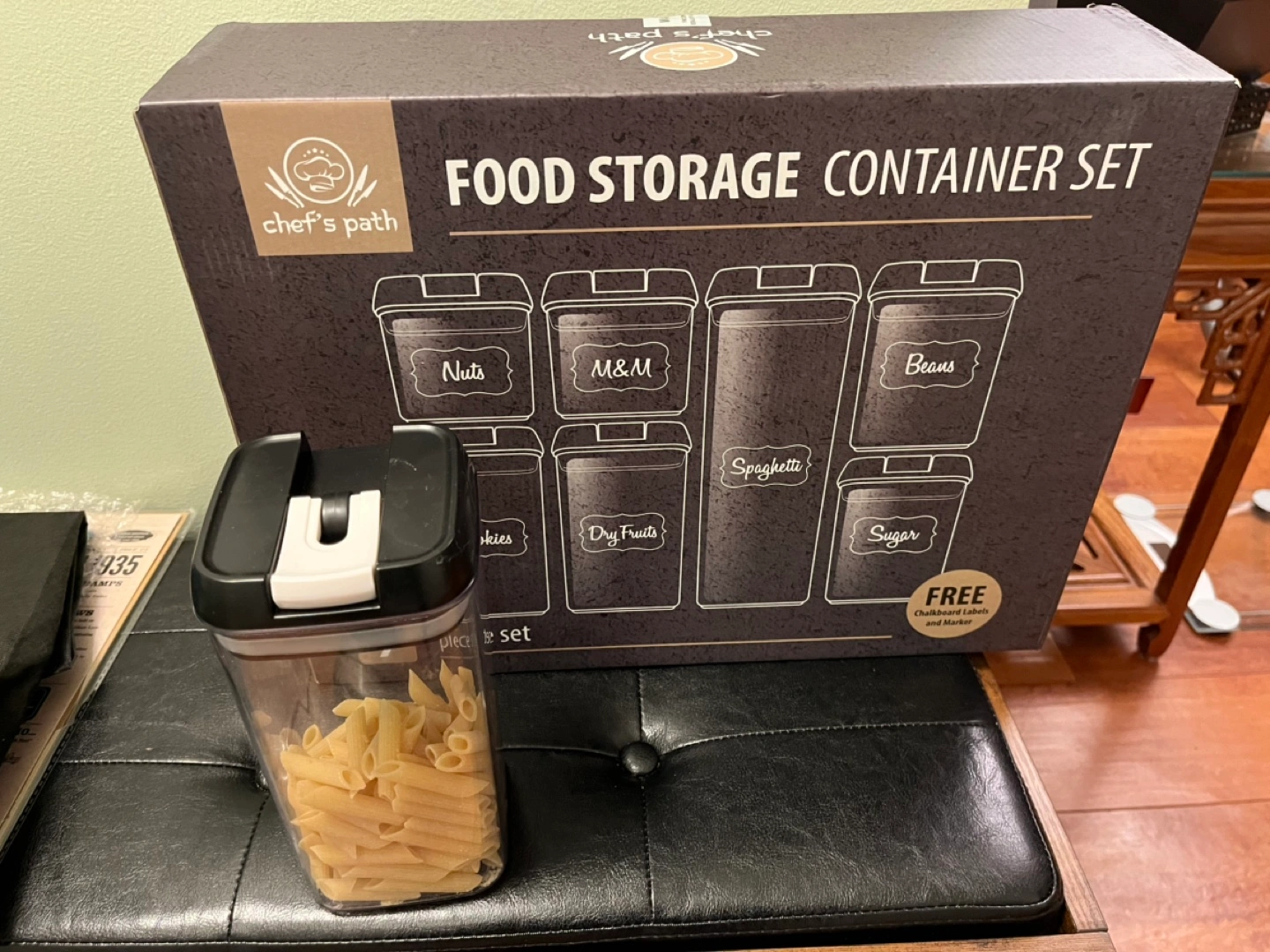 Seven-piece plastic food storage container set. Includes chalkboard labels and marker. BPA free.. Can be used for storing other things besides food.