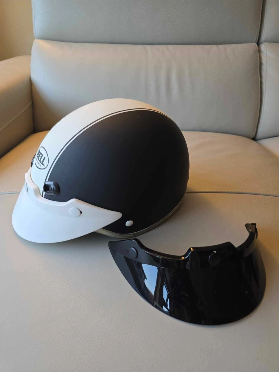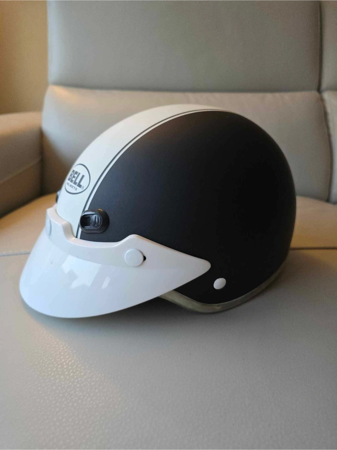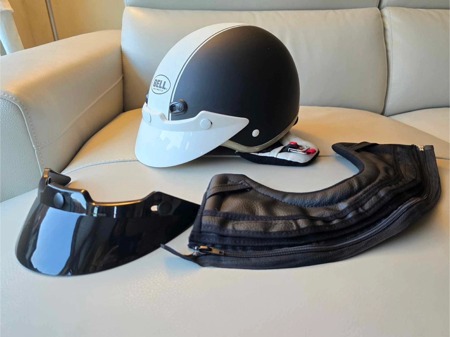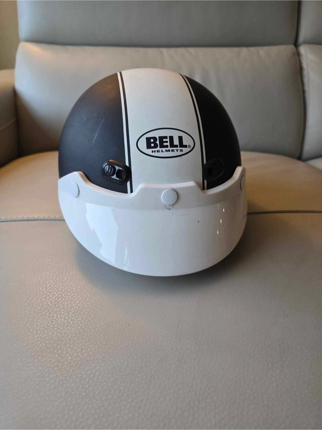 Selling a Bell motorcycle helmet in black and white. It comes with a visor and a neck roll for added comfort and protection.