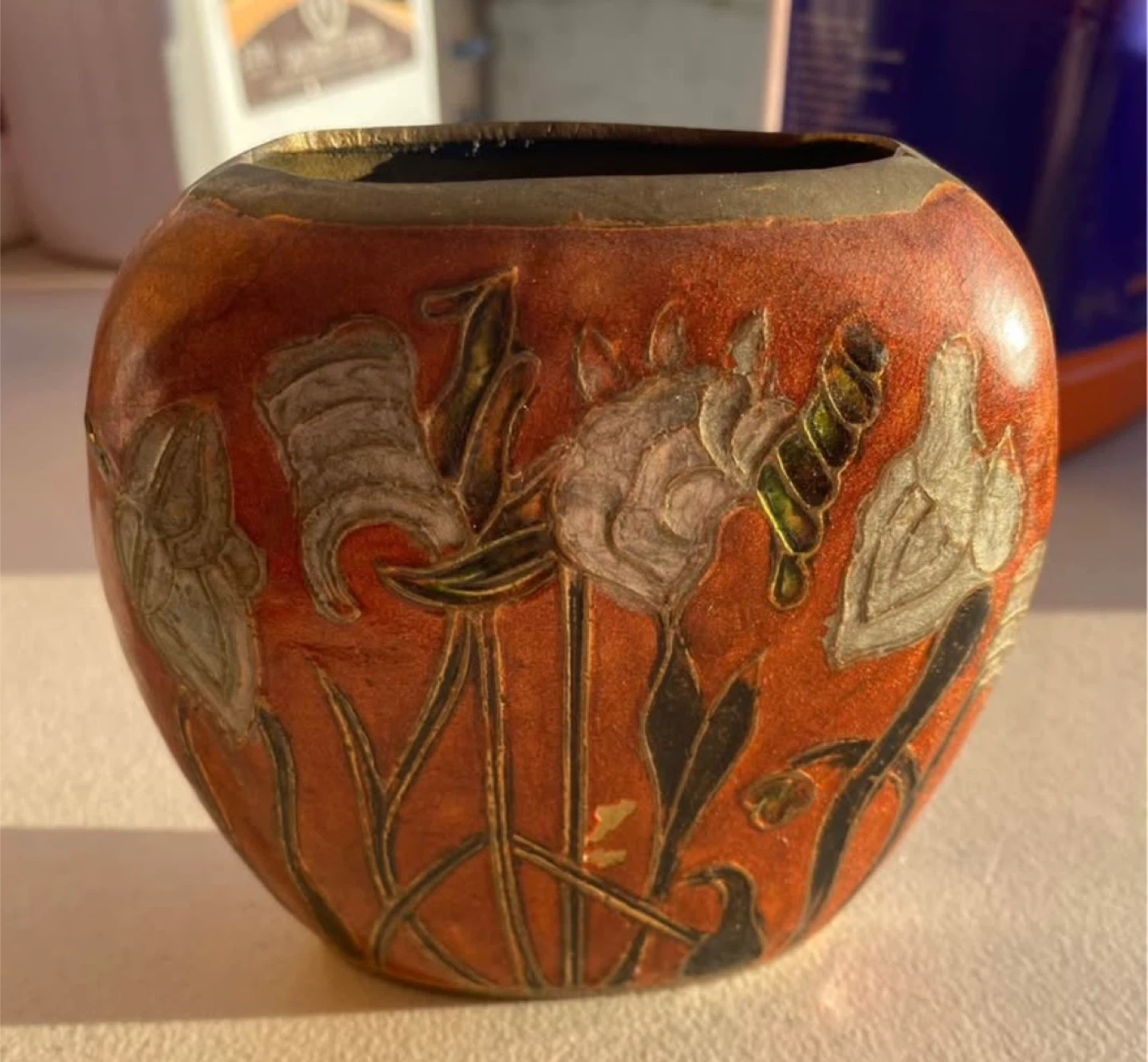 Vintage Indian brass vases with hand-etched enamel florals, handcrafted metalwork from India. Mid-century.