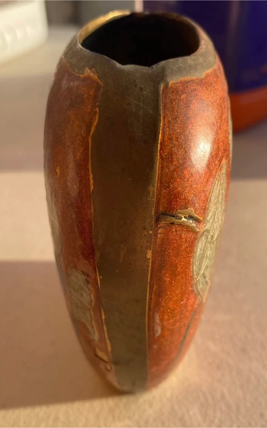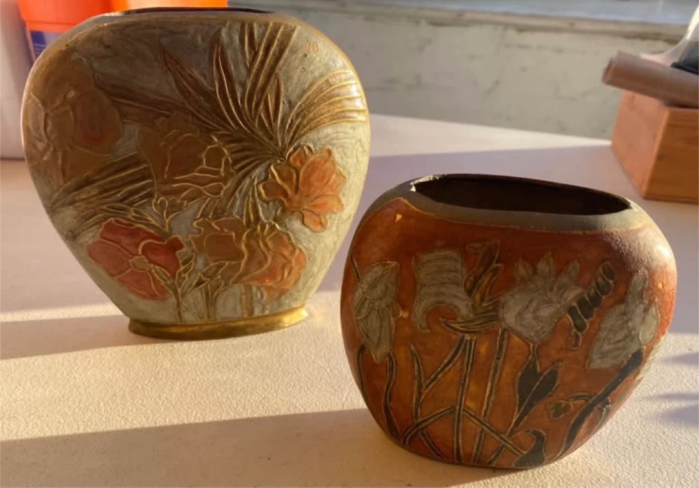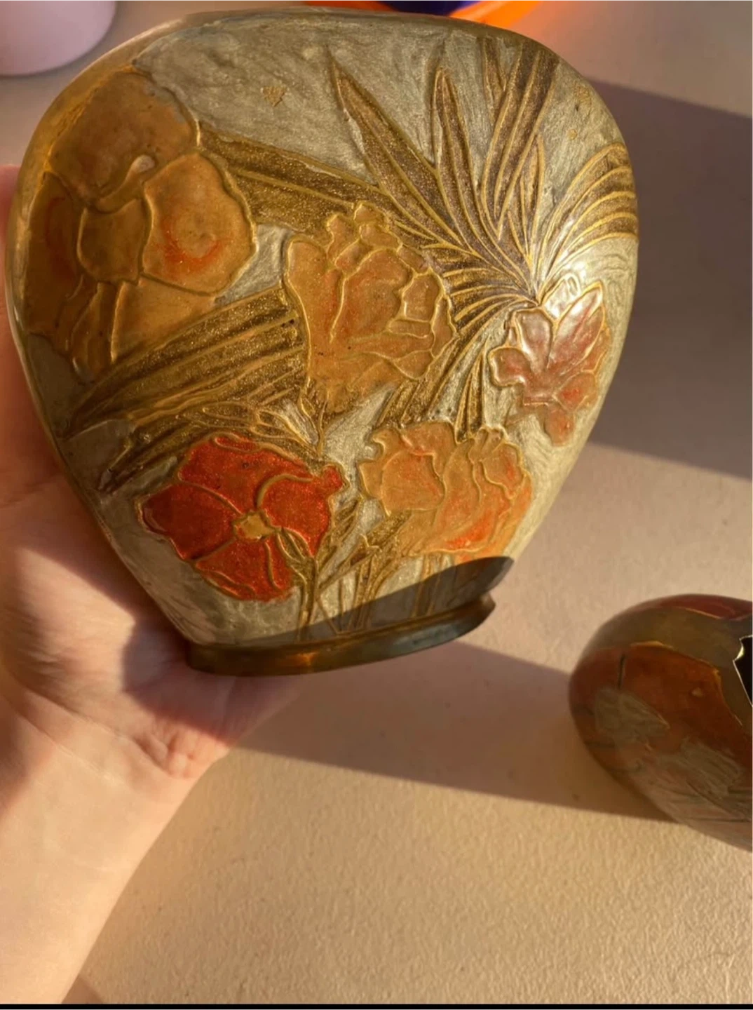 Vintage Indian brass vases with hand-etched enamel florals, handcrafted metalwork from India. Mid-century.