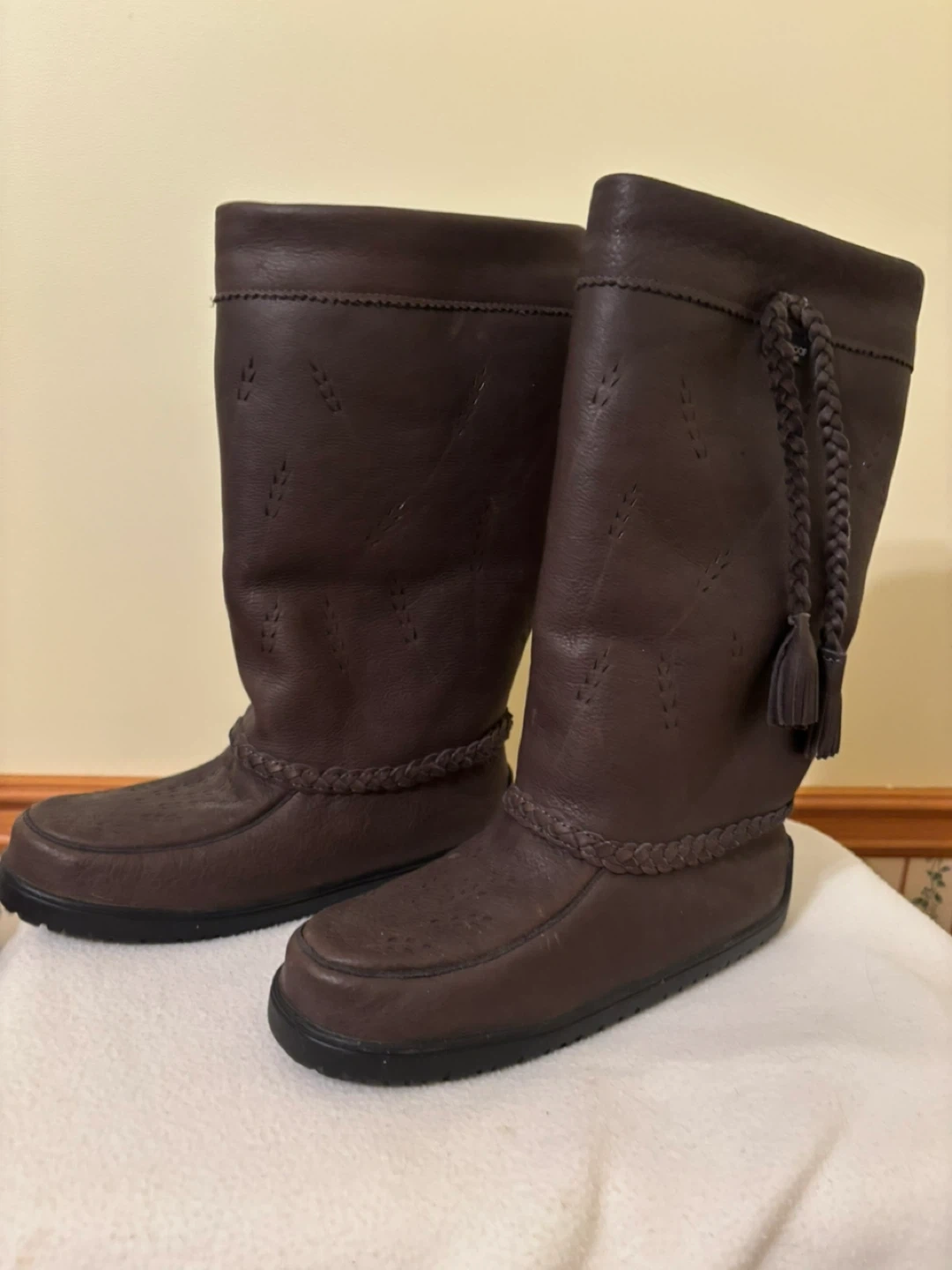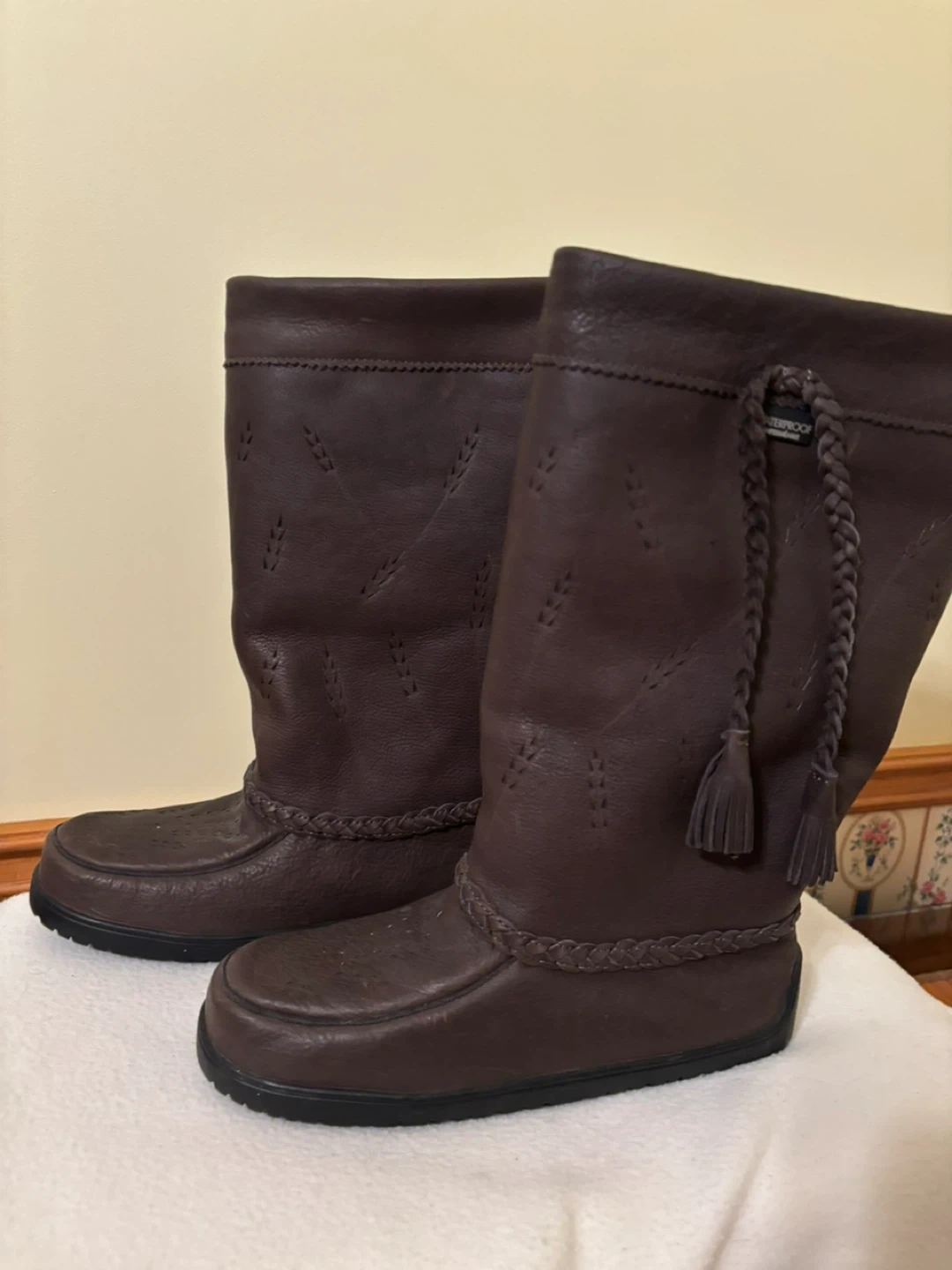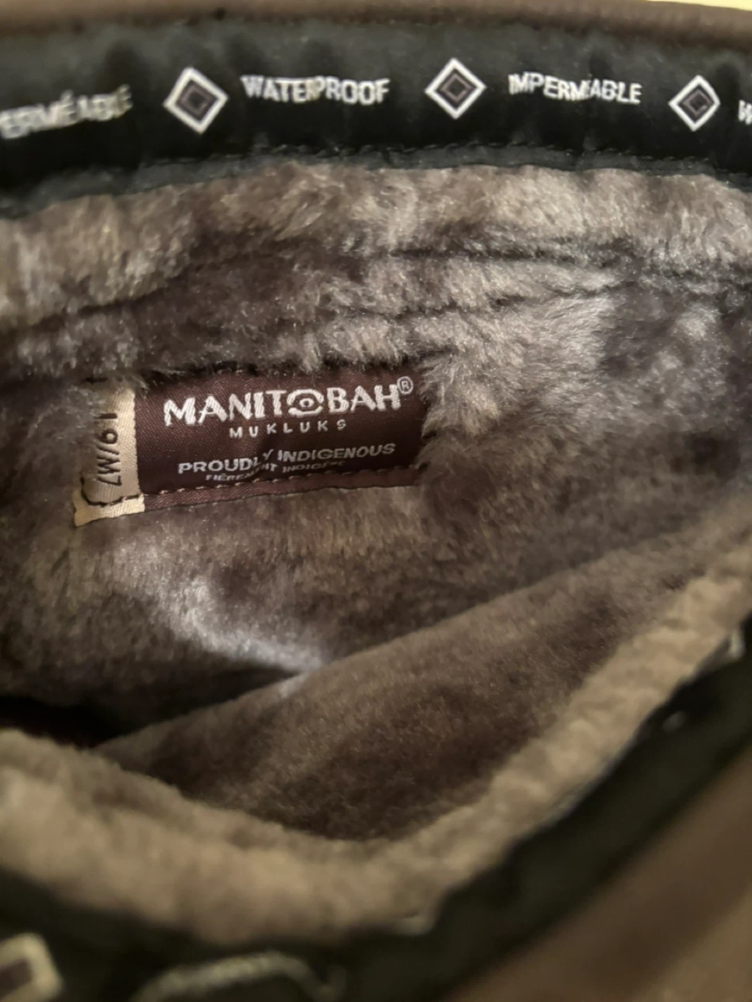 Warm Mukluks boots from Manitobah. Company They're waterproof rubber sole with Leather upper with a cozy sheepskin lining. Sole with great traction. Ladies size 9 men’s size 7
