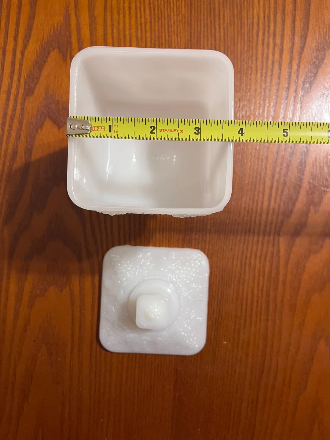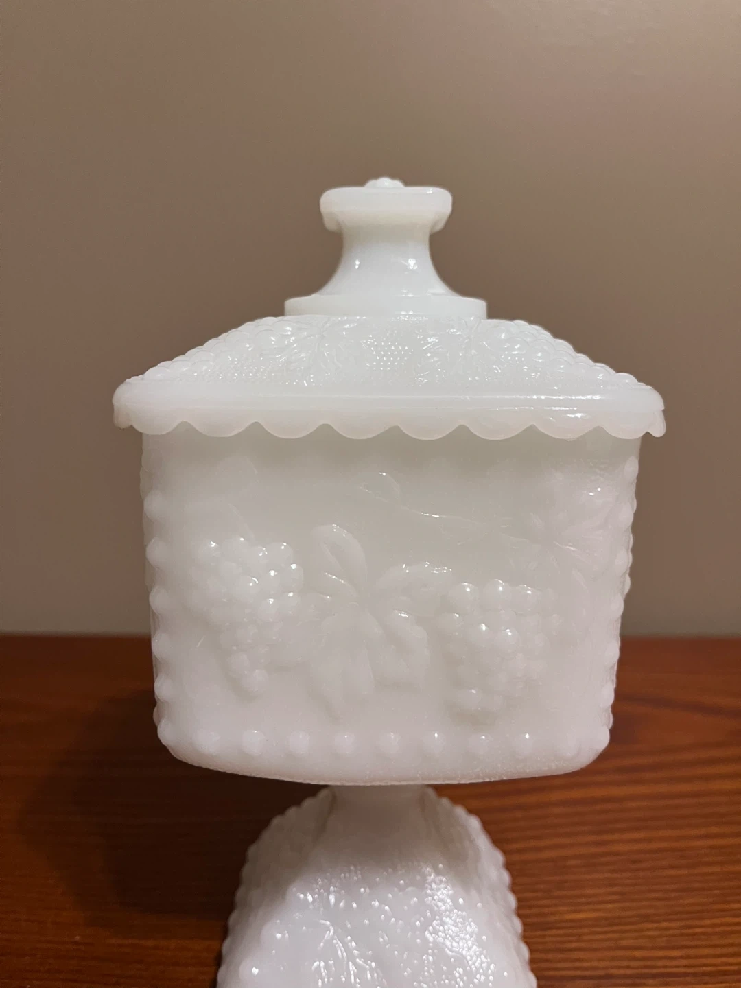 $65 Vintage Anchor Hocking White milk glass candy dish wedding box with beaded grape pattern.