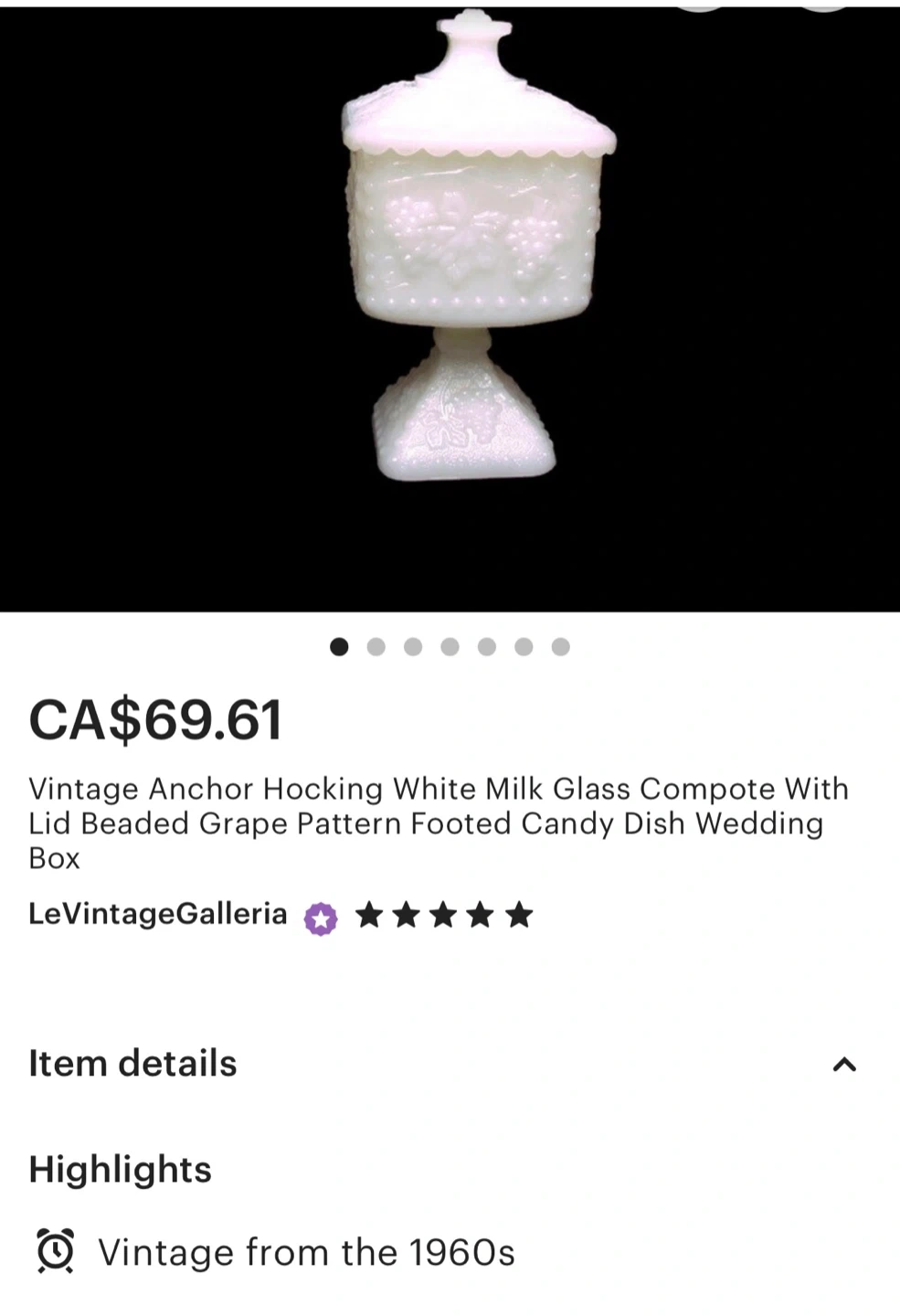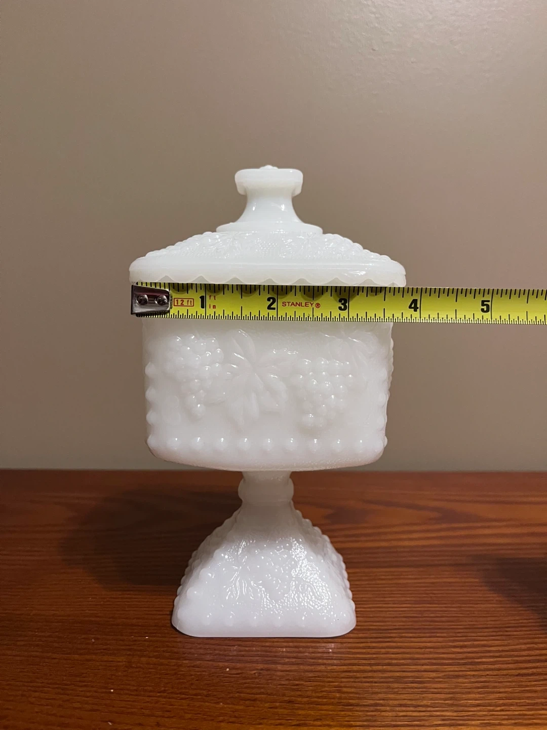 $65 Vintage Anchor Hocking White milk glass candy dish wedding box with beaded grape pattern.