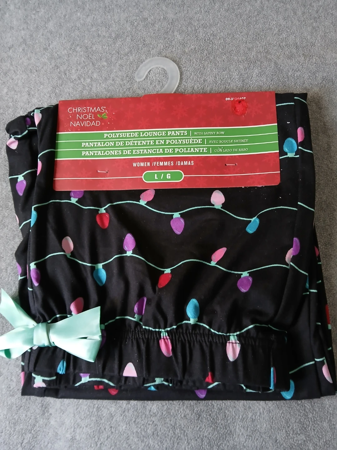 Polysuede lounge pants with a festive Christmas lights pattern. They feature a satin bow accent. Size L/G.