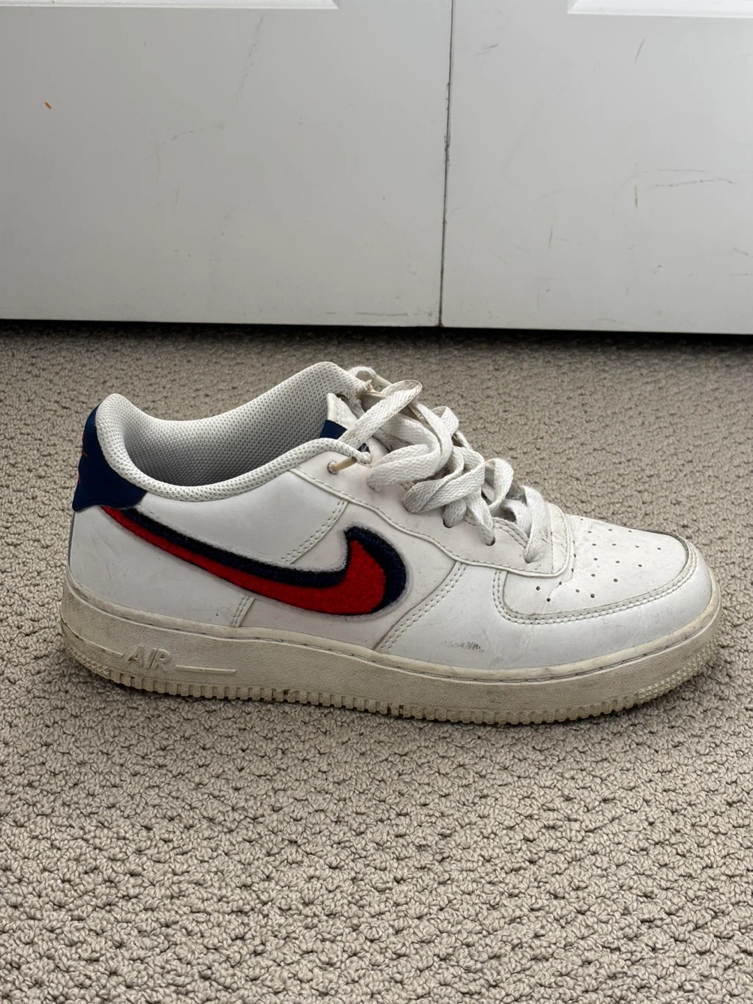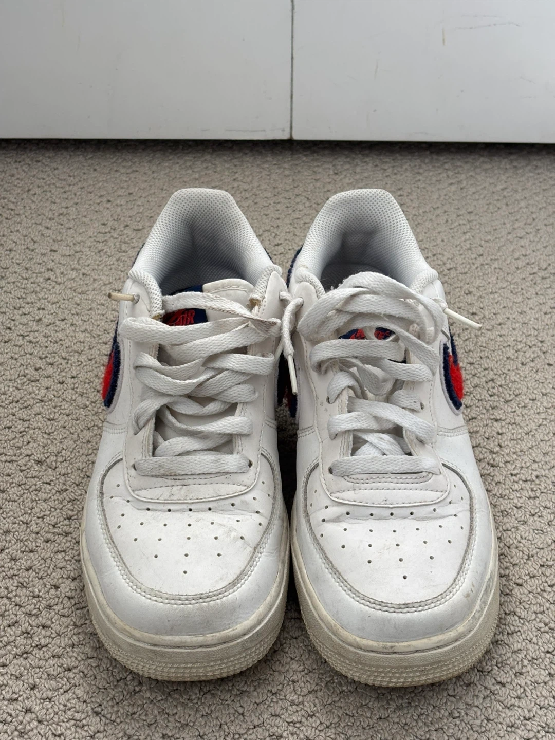 White leather Nike Air Force 1 sneakers with red and blue accents. These classic kicks are perfect for everyday wear. Includes original laces.