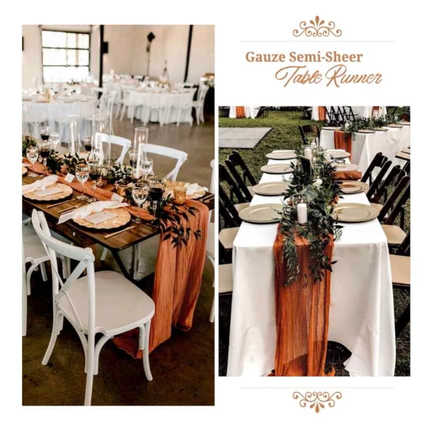 Used once at our wedding. In perfect condition. We have 18 of them. Terracotta cheesecloth table runner, 10ft long. Semi-sheer gauze runner, great for boho or rustic wedding decor, arch draping, bridal showers, or holiday parties.