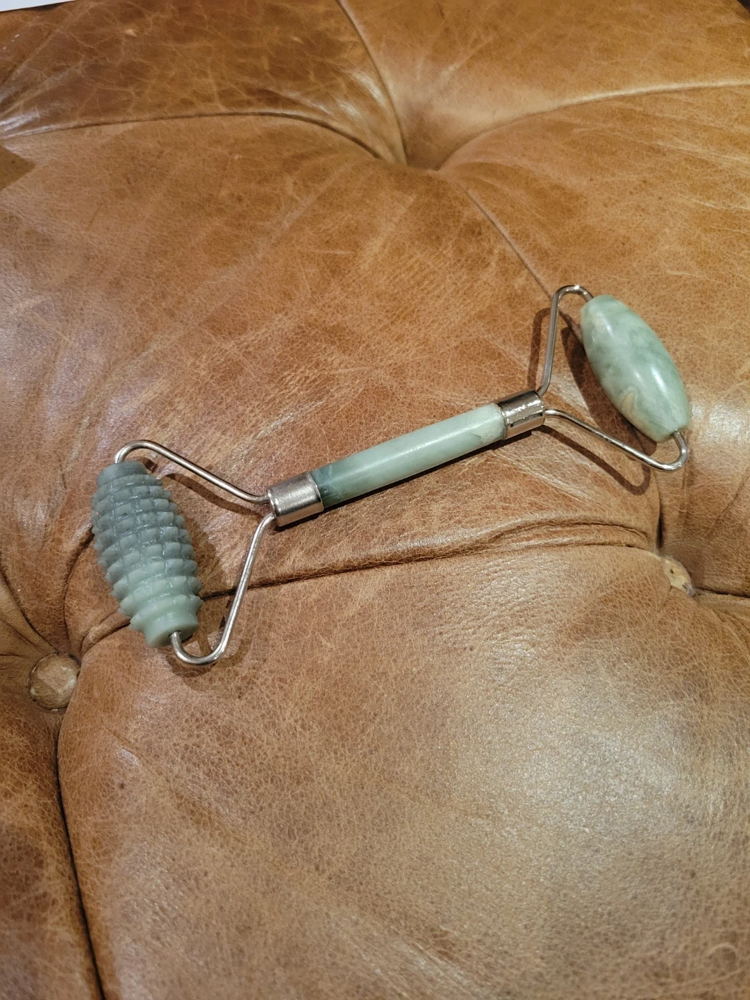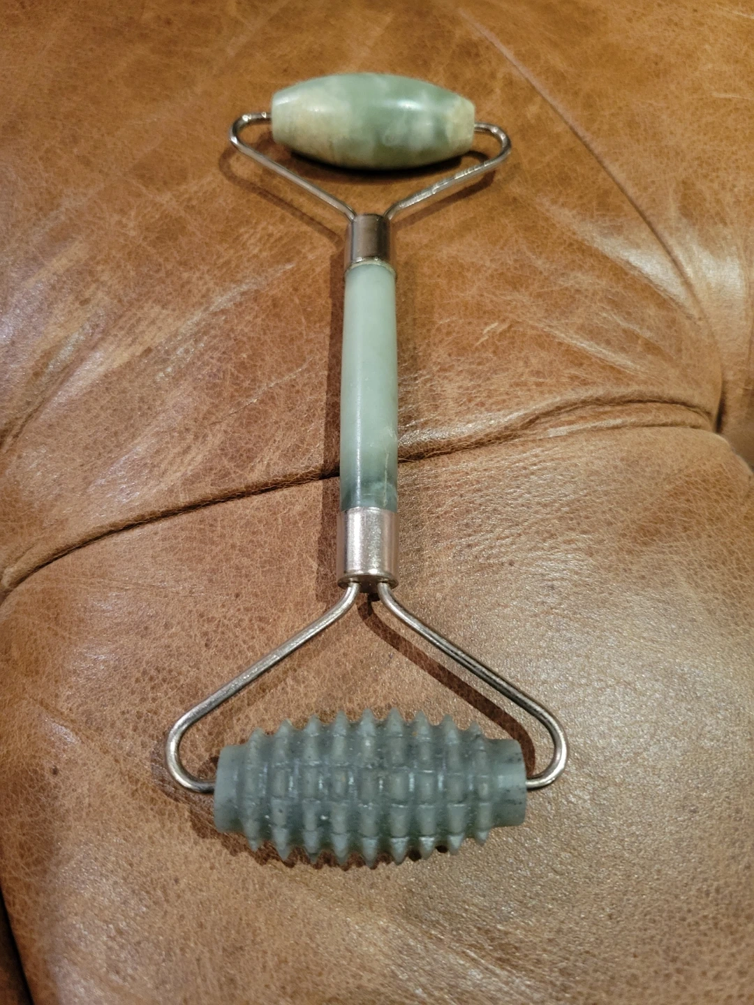 Double-headed facial roller with a smooth jade stone and a textured jade stone. Comes with a separate Gua Sha tool. Used for facial massage and skincare.