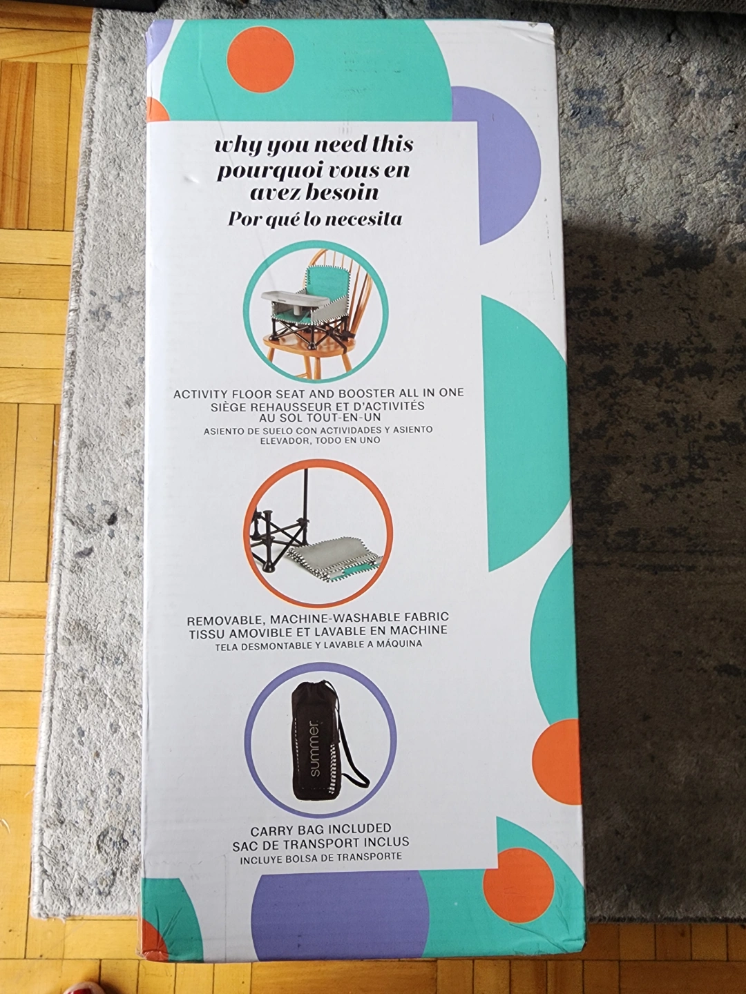 Activity floor seat and booster all in one. Fast, easy and compact fold. Removable and machine-washable fabric. Carry bag included. Perfect for providing your little one with a cozy and comfortable spot to enjoy their playtime.