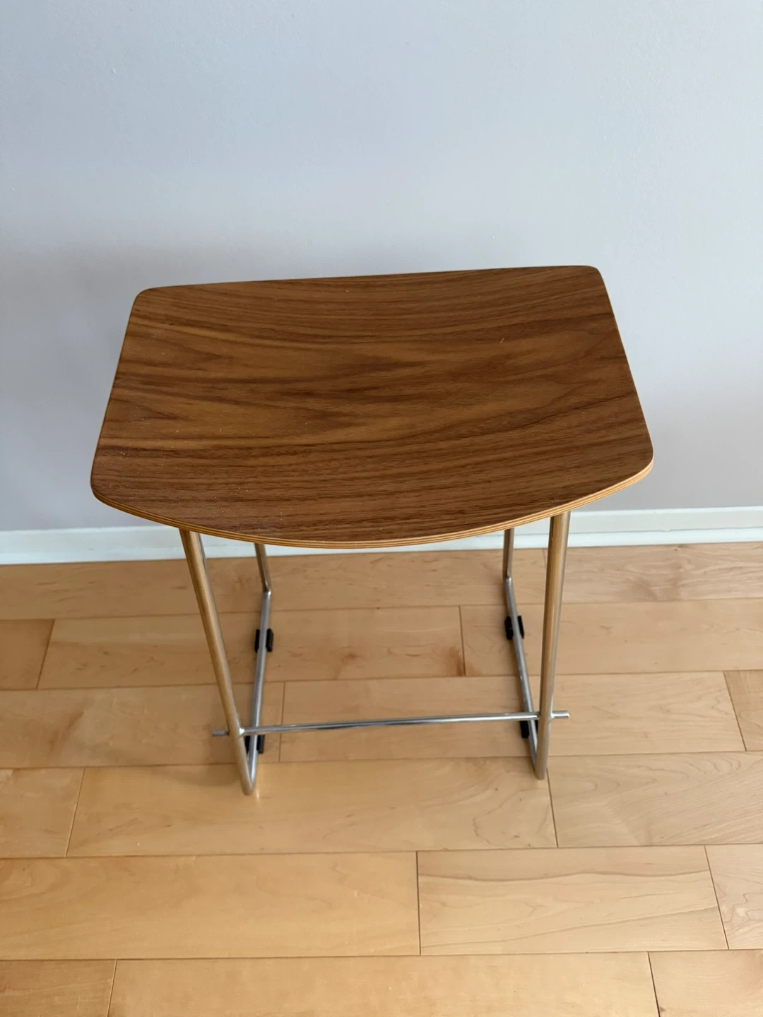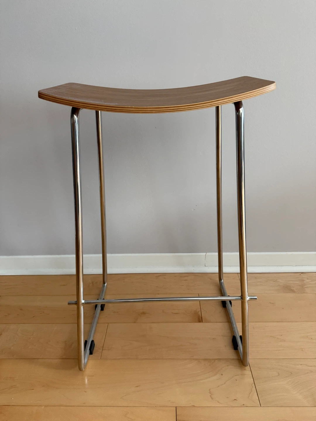 A stylish bar stool featuring a curved wooden seat and a sturdy chrome metal frame. It includes a footrest for added comfort. This stool is great for a kitchen counter or home bar setup.