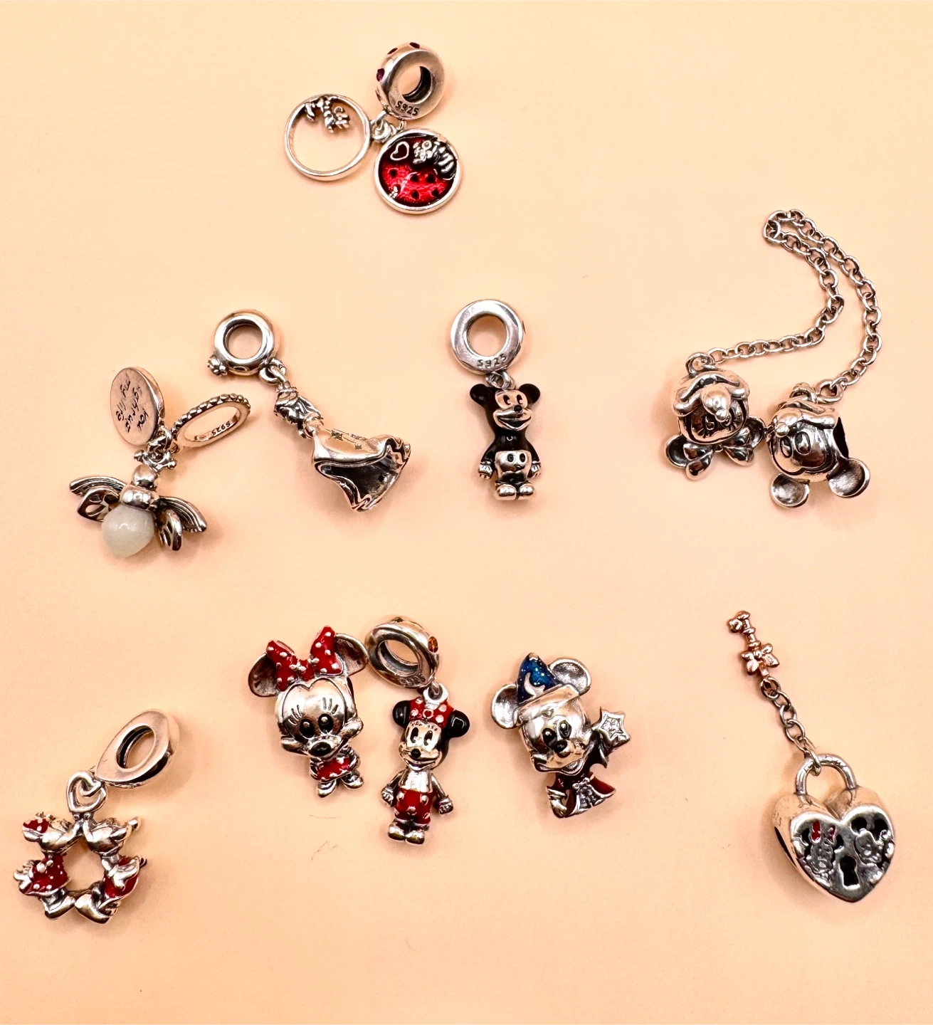 Set of several Disney-themed charms featuring Mickey and Minnie Mouse designs. Most are marked 925 sterling silver. They're great for bracelets and necklaces!